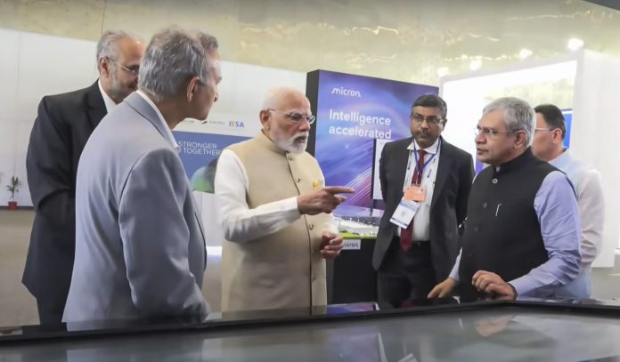 **EDS: THIRD PARTY IMAGE** In this screengrab from a video posted on Sep 03, 2025, Prime Minister Narendra Modi and Union Minister Ashwini Vaishnaw during the Semicon India 2025 at Yashobhoomi, in New Delhi. (@NarendraModi via PTI Photo)(PTI09_03_2025_000050B)