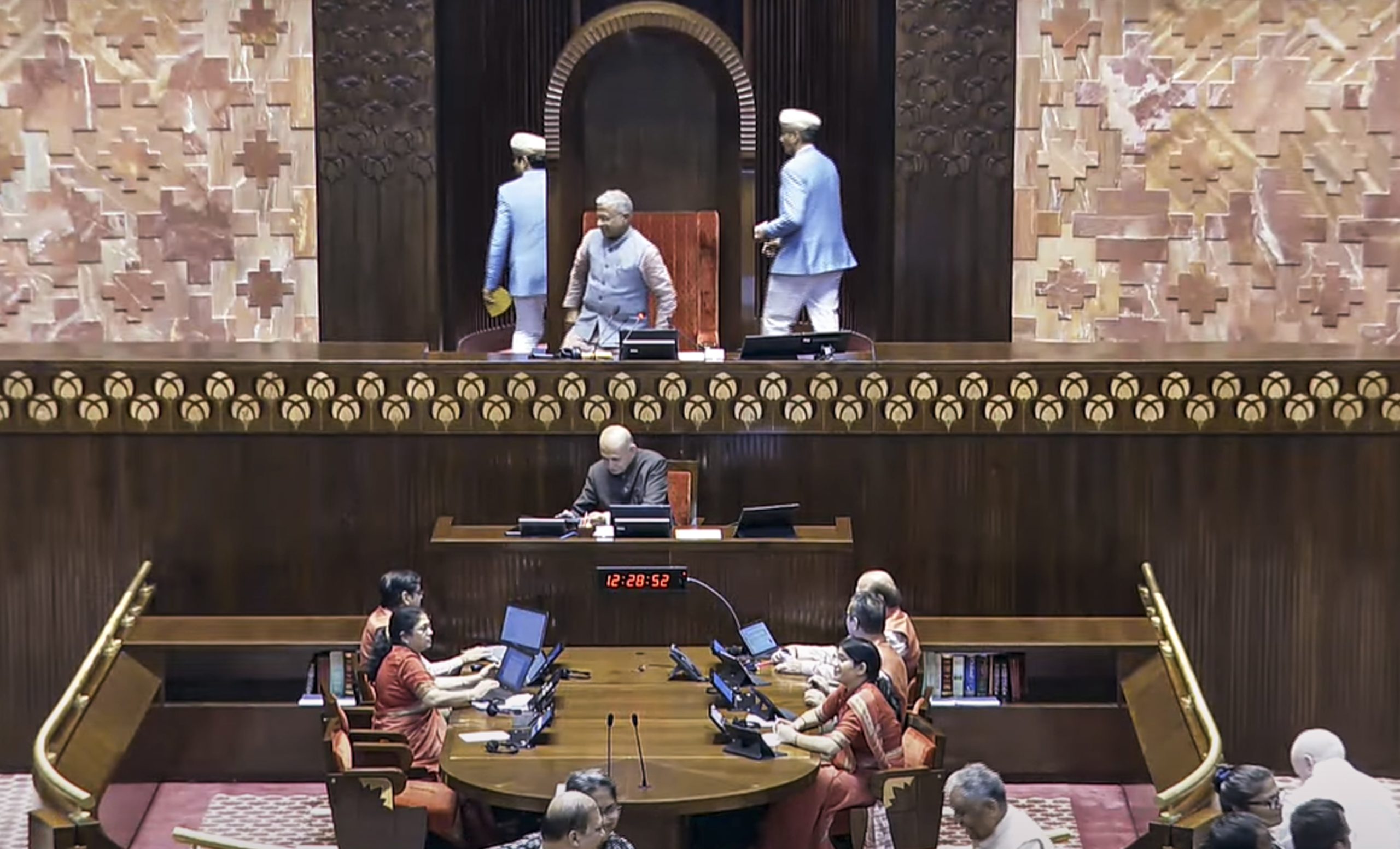 **EDS: THIRD PARTY IMAGE, SCREENGRAB VIA SANSAD TV** New Delhi: Rajya Sabha Deputy Chairman Harivansh Narayan Singh leaves after adjourning the House during the Monsoon session of Parliament, in New Delhi, Thursday, July 24, 2025. (Sansad TV via PTI Photo)(PTI07_24_2025_000168B)