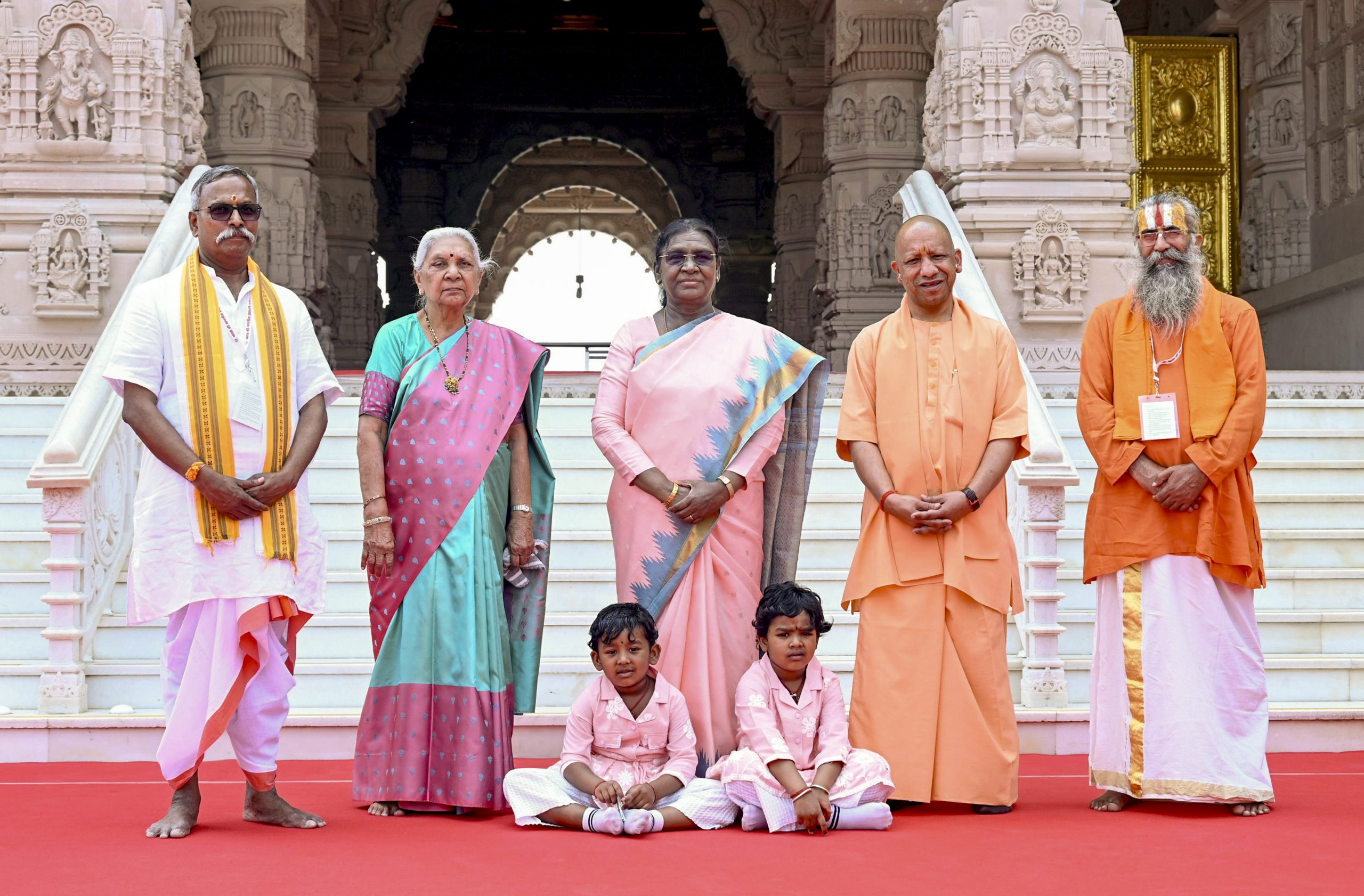 Ayodhya: President Droupadi Murmu, centre, with Uttar Pradesh Governor Anandiben Patel, second left, and Chief Minister Yogi Adityanath, at the 'Shri Ram Janmabhoomi Teerth Kshetra', in Ayodhya, Uttar Pradesh, Thursday, March 19, 2026. (PTI Photo)(PTI03_19_2026_000115B)