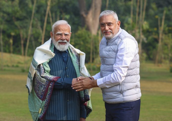 **EDS: THIRD PARTY IMAGE** In this image posted on Jan. 21, 2026, Prime Minister Narendra Modi with Gujarat Bharatiya Janata Party President Jagdish Vishwakarma during a meeting. (@iJagdishBJP/X via PTI Photo) (PTI01_21_2026_000514B)