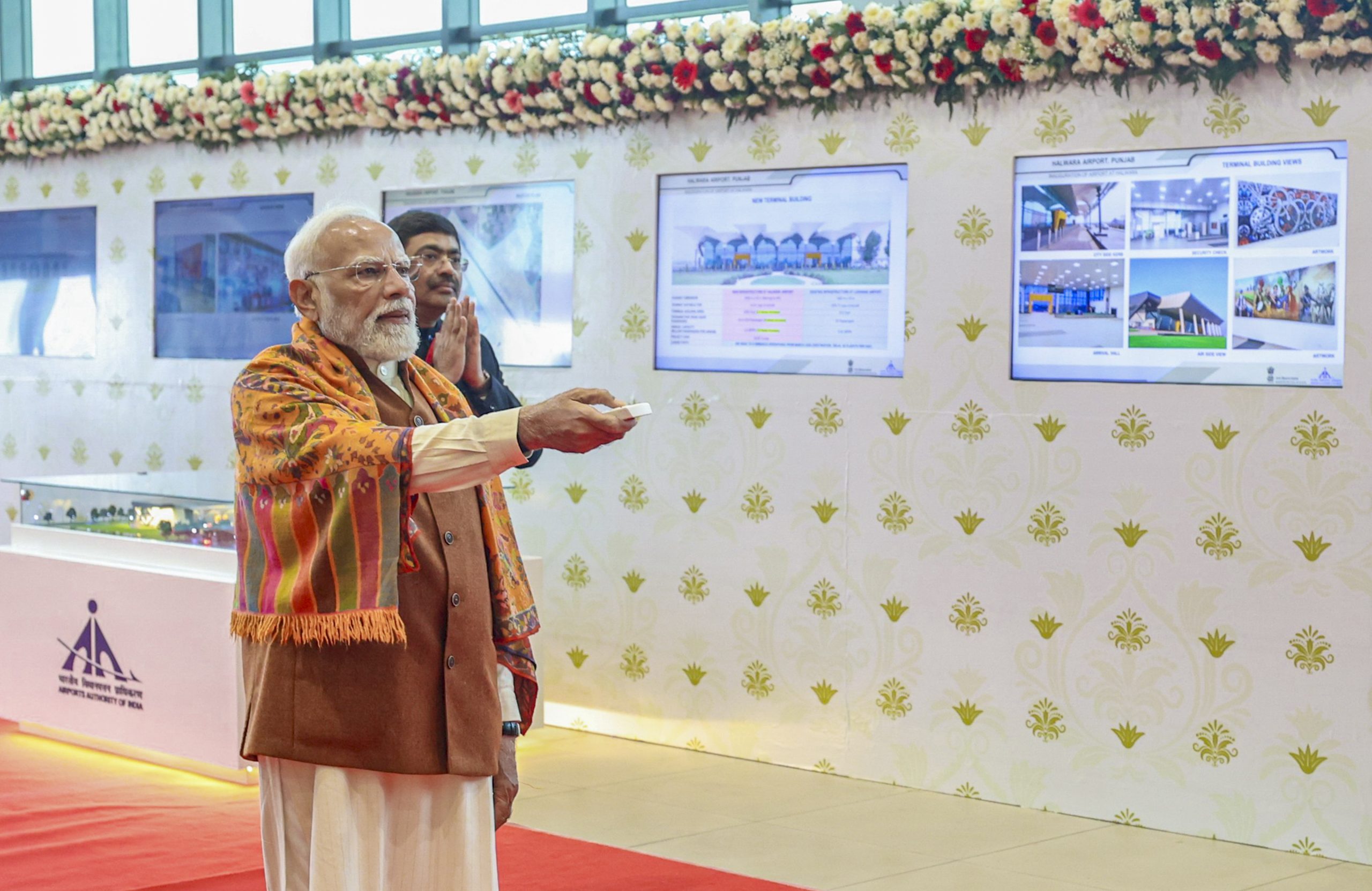 **EDS: THIRD PARTY IMAGE** In this image received on Feb. 1, 2026, Prime Minister Narendra Modi unveils a plaque to mark the renaming of Adampur Airport as 'Shri Guru Ravidass Maharaj Ji Airport', on Guru Ravidas Jayanti, in Adampur, Jalandhar district of Punjab. (PMO via PTI Photo)(PTI02_01_2026_000574B)
