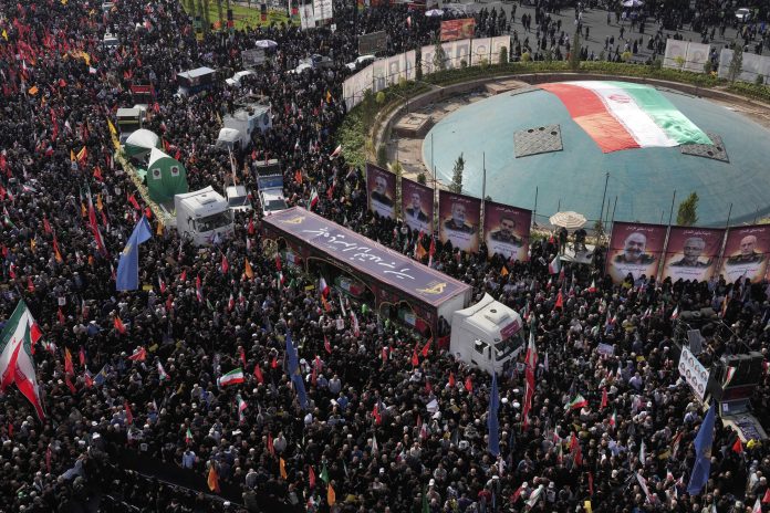 Mourners attend the funeral ceremony of the Iranian armed forces generals, nuclear scientists and their family members who were killed in Israeli strikes, at Islamic Revolution Square (Enghelab Square) square, in Tehran, Iran, Saturday, June 28, 2025. AP/PTI(AP06_28_2025_000087B)