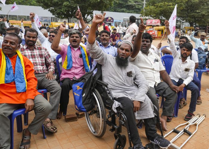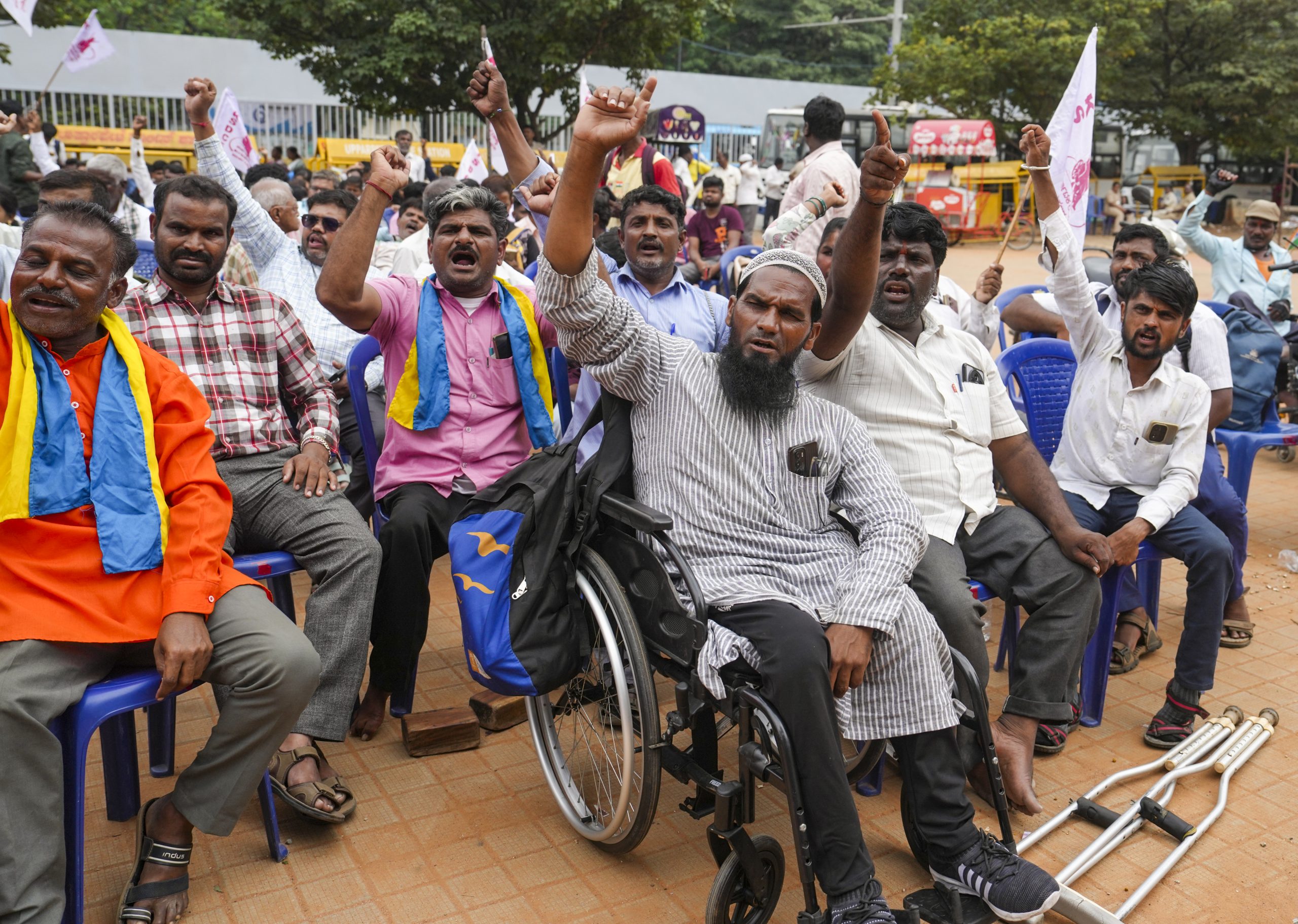 Bengaluru: Members of the Karnataka State Disabled and Caregivers Association raise slogans during a protest demanding hike in pension of persons with disabilities and implementation of welfare schemes, at Freedom Park, in Bengaluru, Karnataka, Wednesday, Oct. 8, 2025. (PTI Photo/Shailendra Bhojak) (PTI10_08_2025_000356B)