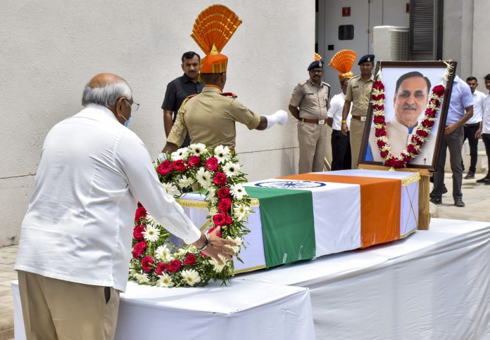 **EDS: THIRD PARTY IMAGE** In this image released by @Bhupendrapbjp via X on June 16, 2025, Gujarat Chief Minister Bhupendra Patel pays tribute to former chief minister Vijay Rupani, who died in the Air India plane crash, outside the mortuary of a hospital in Ahmedabad. (@Bhupendrapbjp via PTI Photo) (PTI06_16_2025_000137B)