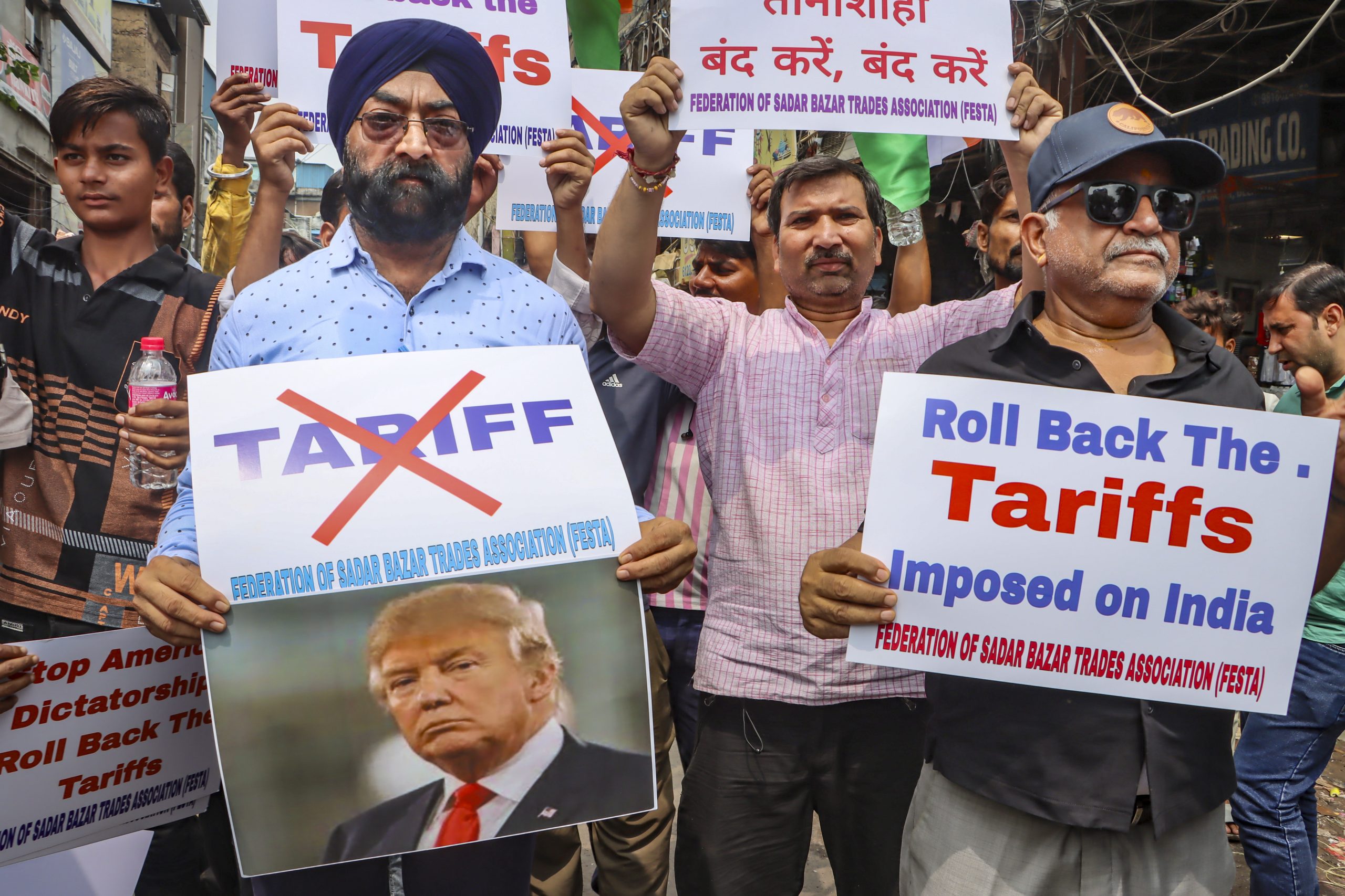 વેપારીઓએ “ટેરિફ નીતિ પાછી ખેંચો” અને “આર્થિક સરમુખત્યારશાહી બંધ કરો” જેવા સંદેશાઓ લખેલા પ્લેકાર્ડ પકડી રાખ્યા હતા.