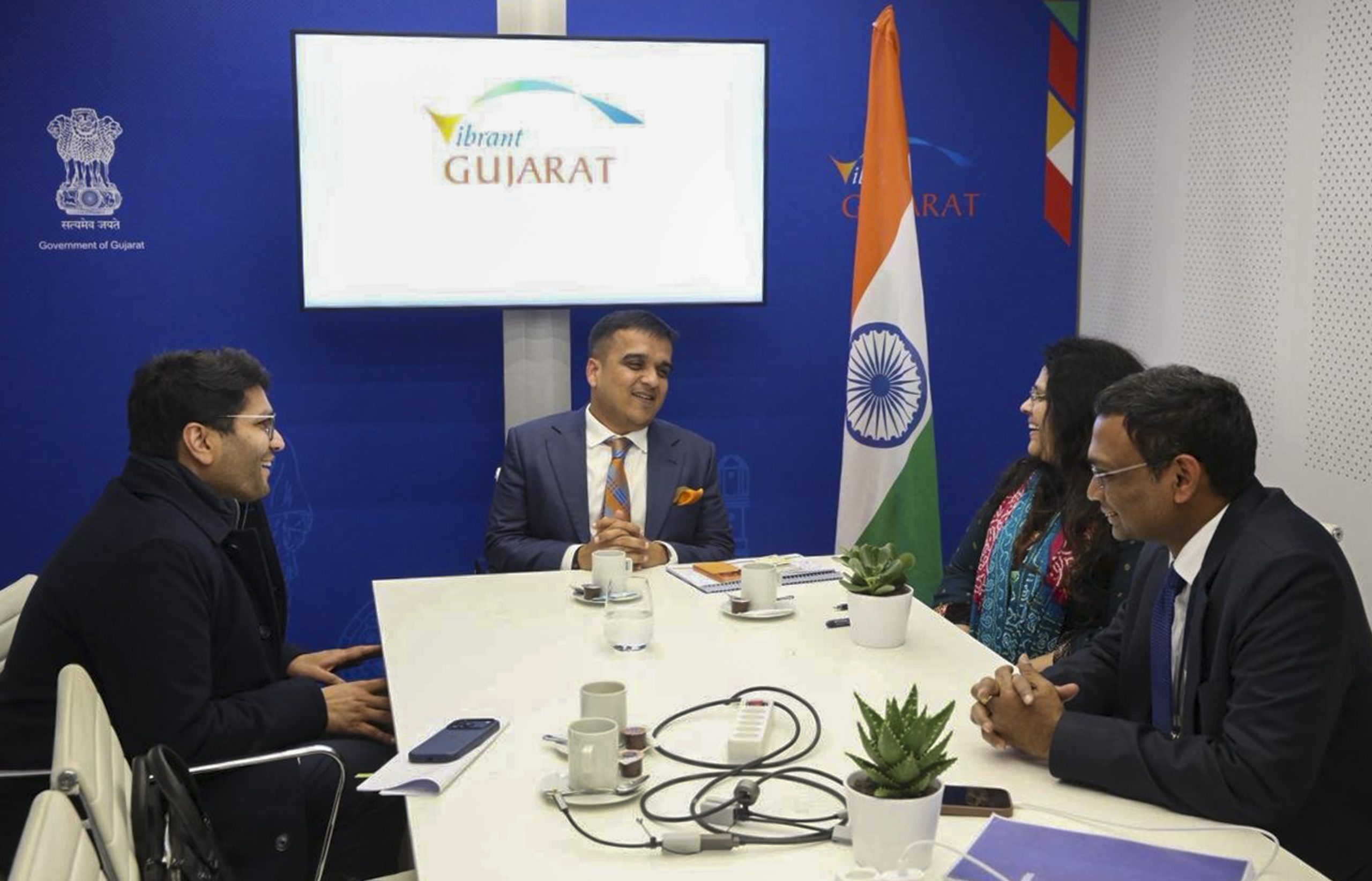 **EDS: THIRD PARTY IMAGE** In this image posted on Jan. 21, 2026, Gujarat Deputy Chief Minister Harsh Sanghavi, second left, meets RPSG Group Director Shashwat Goenka, left, during a meeting, in Davos, Switzerland. (Gujarat Deputy CMO via PTI Photo)(PTI01_21_2026_000396B)