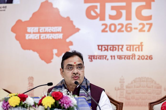 Jaipur: Rajasthan Chief Minister Bhajanlal Sharma addresses a press conference after presentation of the state Budget for the fiscal year 2026-27 by Deputy Chief Minister and Finance Minister Diya Kumari, in Jaipur, Wednesday, Feb. 11, 2026. (PTI Photo)(PTI02_11_2026_000228B)