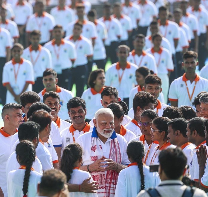 વિશાખાપટ્ટનમ (આંધ્ર પ્રદેશ), ૨૧ જૂન (PTI) – પ્રધાનમંત્રી નરેન્દ્ર મોદીએ શનિવારે જણાવ્યું હતું કે યોગ લોકોને વિશ્વ સાથે એકાકાર થવાની યાત્રા તરફ દોરી જાય છે, જ્યારે આંતરરાષ્ટ્રીય યોગ દિવસ (International Yoga Day) માનવતા માટે આ પ્રાચીન પ્રથાની શરૂઆત દર્શાવે છે, જ્યાં આંતરિક શાંતિ વૈશ્વિક નીતિ બની જાય છે.