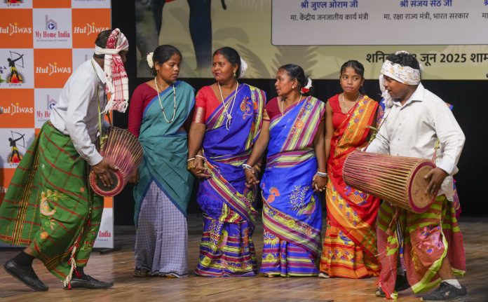 New Delhi: Artistes perform during a ‘Hul Diwas’ event, in New Delhi, Saturday, June 28, 2025. (PTI Photo/Shahbaz Khan) (PTI06_28_2025_000197B)