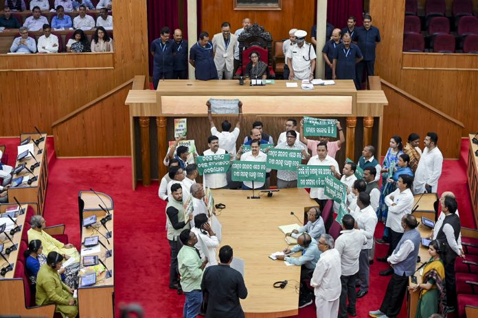 ବିରୋଧୀ ସଦସ୍ଯ଼ମାନେ ସରକାର ବିରୋଧୀ ସ୍ଲୋଗାନ ଦେଇଥିଲେ, ବାଚସ୍ପତିଙ୍କ ପୋଡିଯ଼ମ୍ ନିକଟରେ ପ୍ଲାକାର୍ଡ ଏବଂ ବ୍ଯ଼ାନର ପ୍ରଦର୍ଶନ କରିଥିଲେ, ଯାହାଫଳରେ କାର୍ଯ୍ଯ଼ ସ୍ଥଗିତ ରଖାଯାଇଥିଲା।
