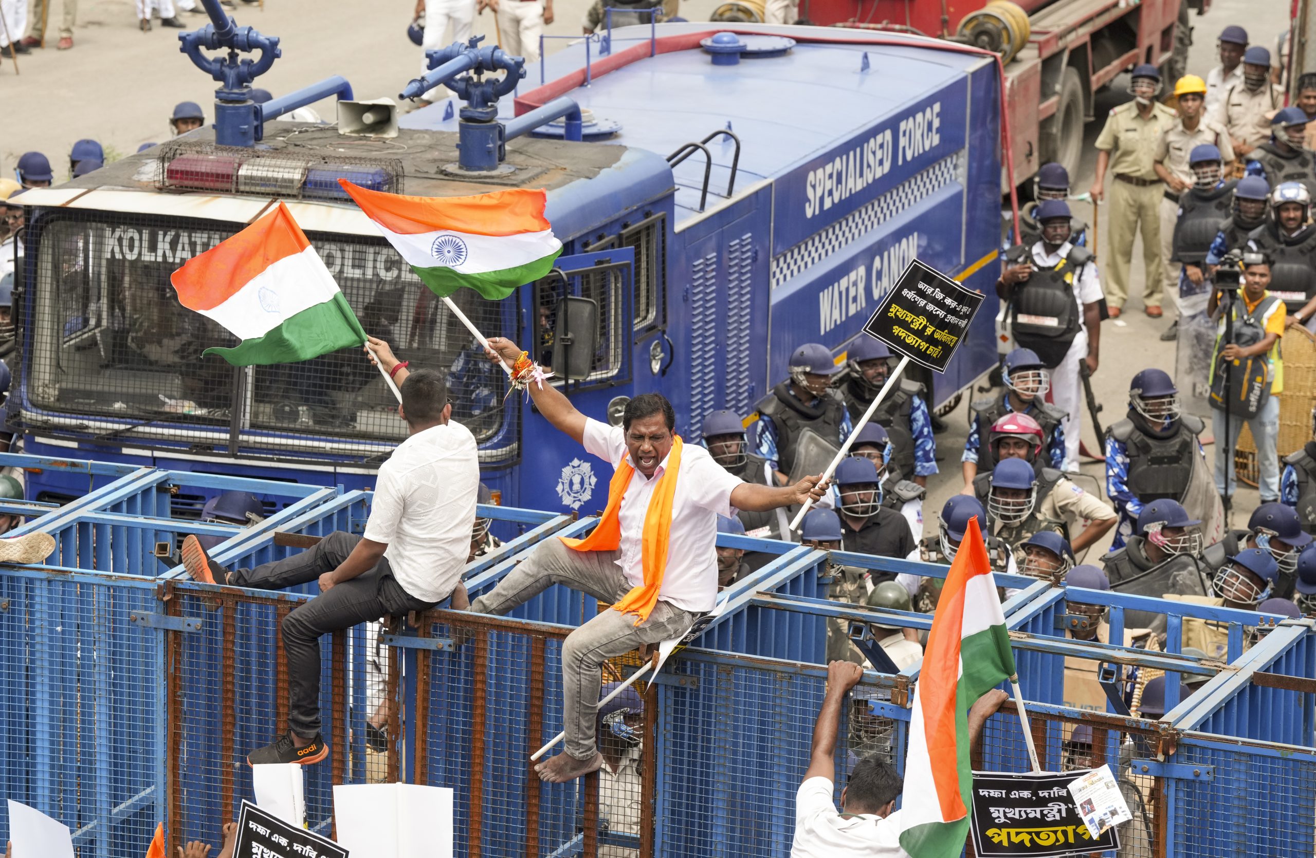 சட்டம் ஒழுங்கை பராமரிக்க கல்கத்தா உயர் நீதிமன்ற உத்தரவை போராட்டக்காரர்கள் பின்பற்ற வேண்டும் என்று காவல்துறையினர் ஒலிபெருக்கிகள் மூலம் தொடர்ந்து எச்சரிக்கை விடுத்து வந்த நிலையில், போராட்டக்காரர்கள் 10 அடி உயர தடுப்புகளை மீறிச் செல்வதைக் காண முடிந்தது. PTI SMY BDC