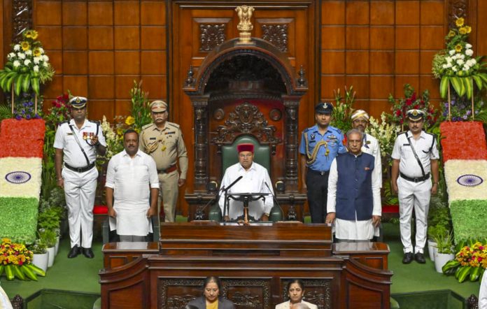 Bengaluru: Karnataka Governor Thaawarchand Gehlot, state Assembly Speaker UT Khader and Legislative Council Chairman Basavaraj Horatti stand during the joint session of the state legislature, at Vidhana Soudha, in Bengaluru, Thursday, Jan. 22, 2026. (PTI Photo) (PTI01_22_2026_000060B)