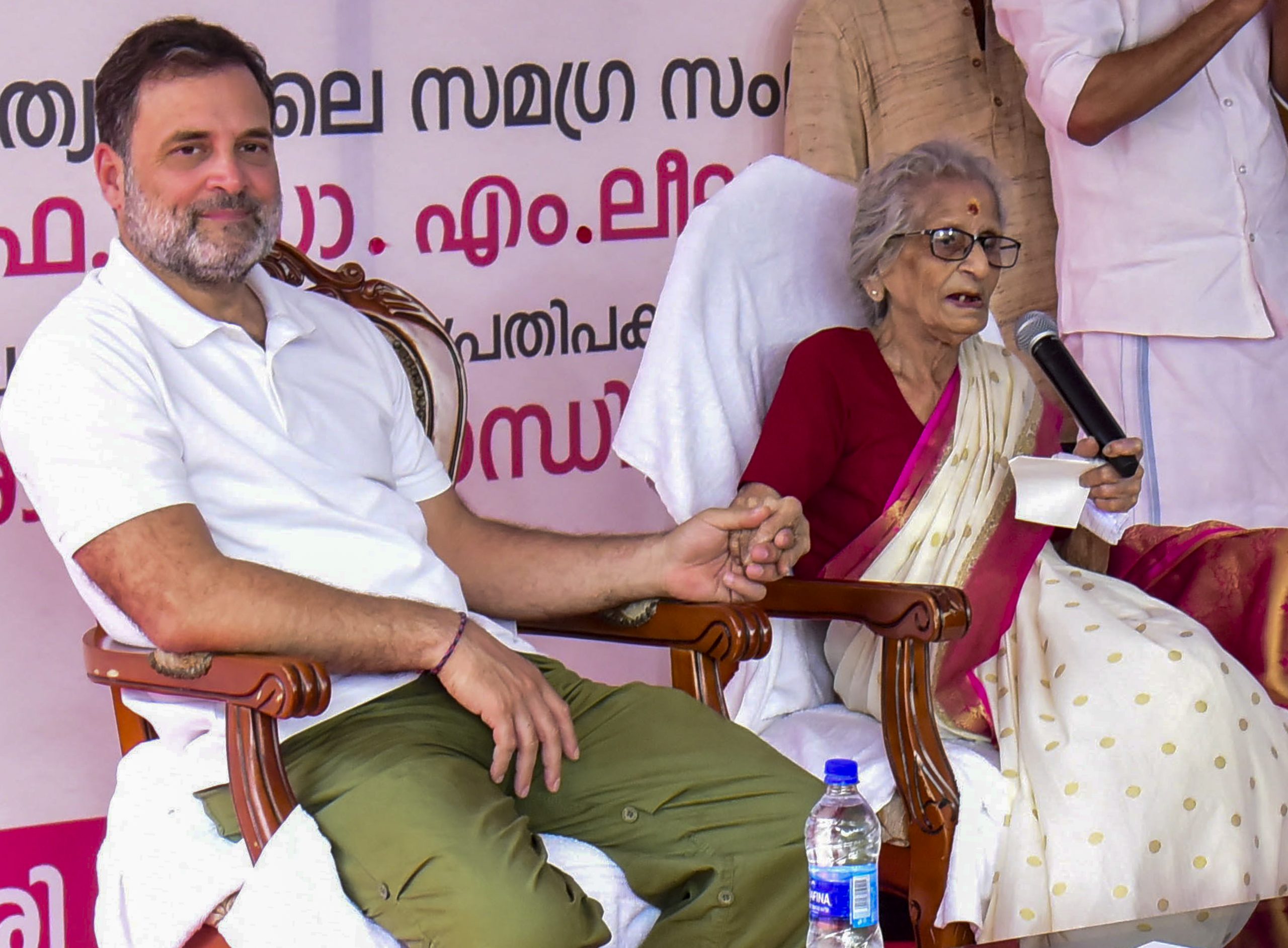 Kochi: LoP in the Lok Sabha Rahul Gandhi with Malayalam writer M. Leelavathy, after she received the Priyadarshini Literary Award by the KPCC, during a ceremony in Kalamassery, Kochi, Monday, Jan. 19, 2026. (PTI Photo) (PTI01_19_2026_000198B)