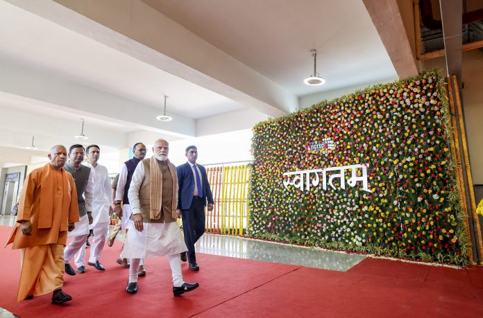 **EDS: THIRD PARTY IMAGE** In this image posted on Feb. 22, 2026, Prime Minister Narendra Modi during the flagging off of the Meerut Metro and Namo Bharat train at a ceremonial launch at Shatabdi Nagar Namo Bharat Station in Meerut. Uttar Pradesh Chief Minister Yogi Adityanath, Deputy Chief Minister Brajesh Pathak, BJP State President Pankaj Chaudhary and others are also seen. (narendramodi.in via PTI Photo)(PTI02_22_2026_000104B)