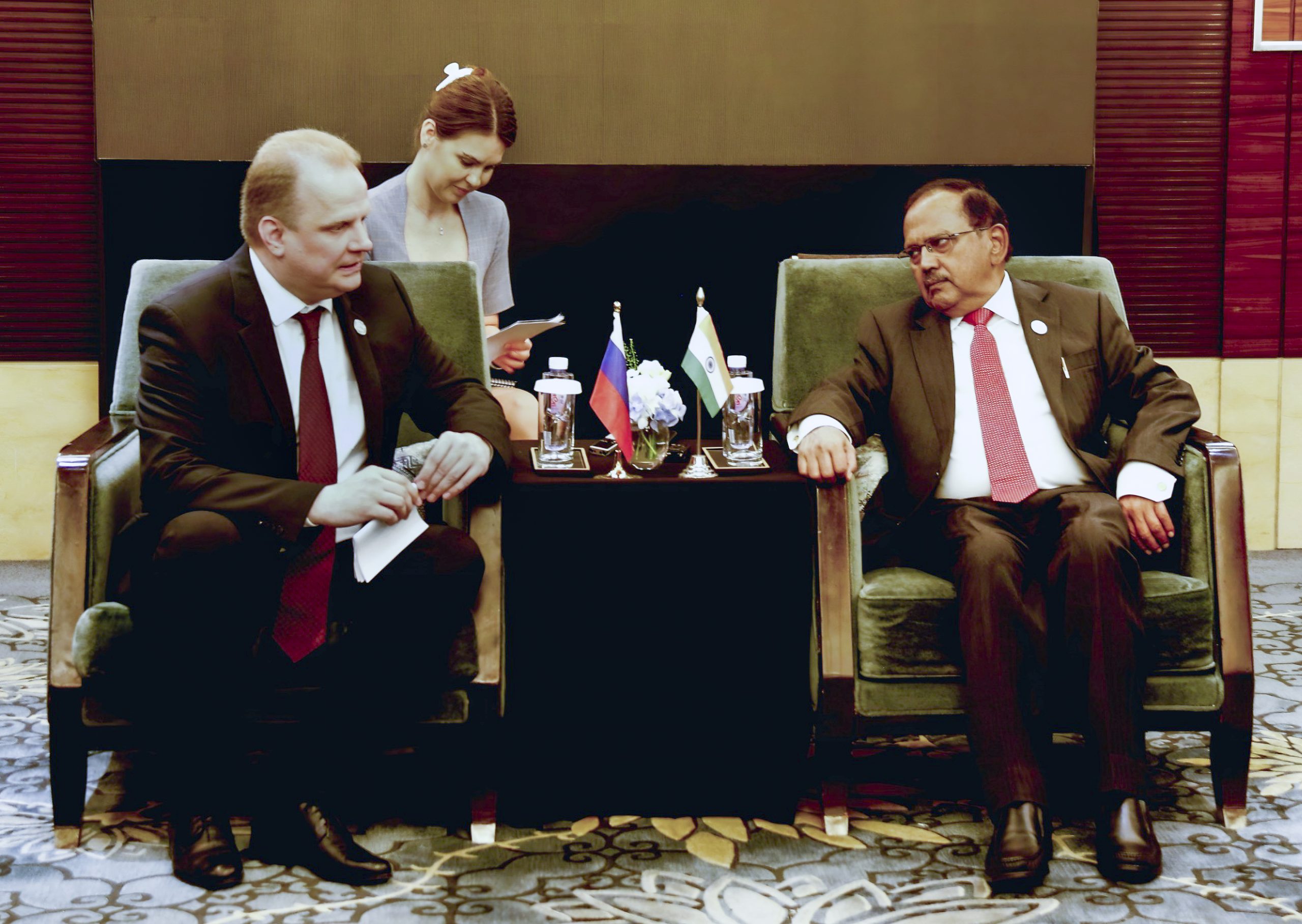 **EDS: THIRD PARTY IMAGE** In this image released by @EOIBeijing via X on June 24, 2025, NSA Ajit Doval with Deputy Secretary of the Security Council of the Russia Aleksandr Venediktov during a meeting, on the sidelines of the 20th Meeting of the SCO Security Council Secretaries, in Beijing, China. (@EOIBeijing via PTI Photo)(PTI06_24_2025_000115B)