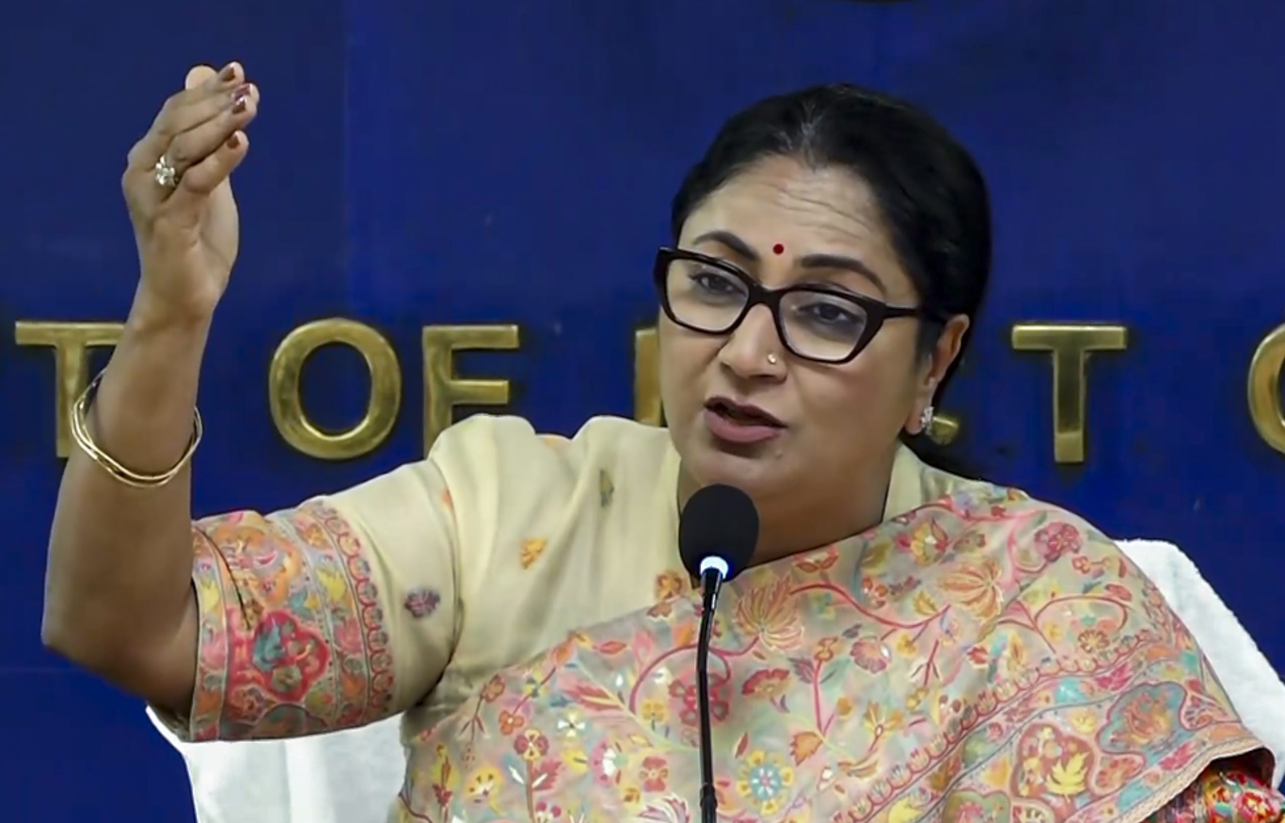 **EDS: SCREENGRAB VIA PTI VIDEOS** New Delhi: Delhi Chief Minister Rekha Gupta addresses a press conference, in New Delhi, Tuesday, Feb. 10, 2026. (PTI Photo)(PTI02_10_2026_000577B)