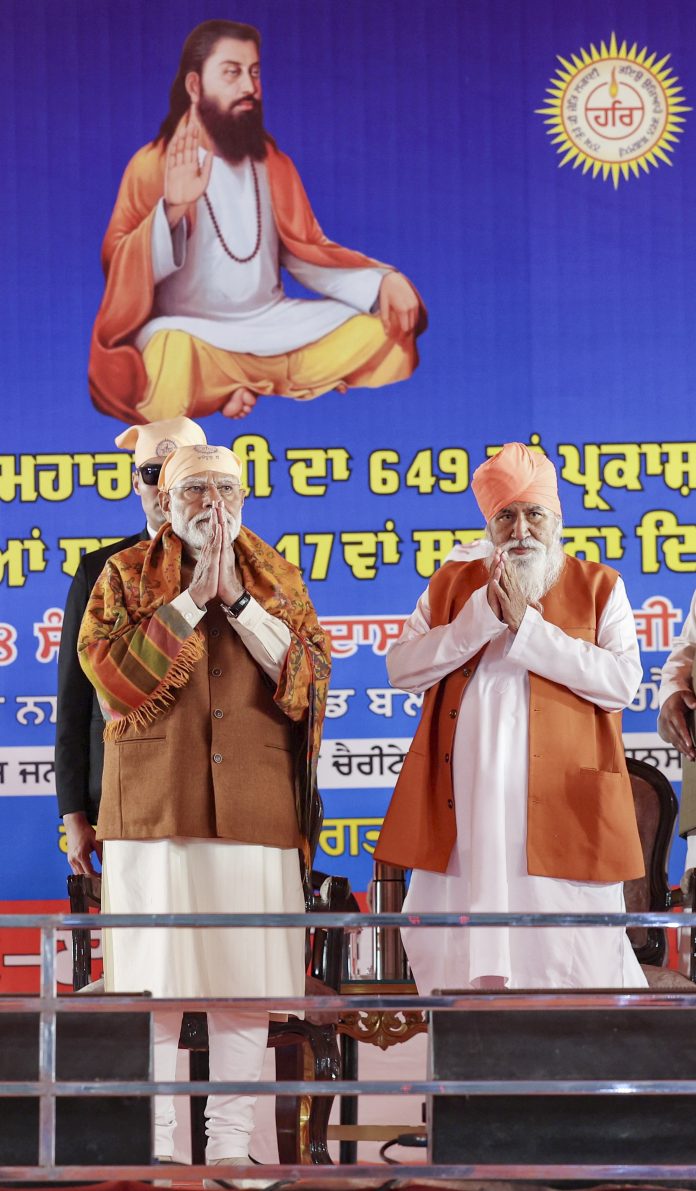 **EDS: THIRD PARTY IMAGE** In this image posted on Feb. 1, 2026, Prime Minister Narendra Modi and Sant Niranjan Dass, right, during a programme organised on the occasion of the 649th birth anniversary of Guru Ravidas, in Jalandhar, Punjab. (narendramodi.in via PTI Photo)(PTI02_01_2026_000546B)