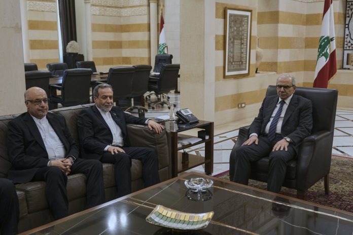 Iranian Foreign Minister Abbas Araghchi, center, and Iranian Ambassador to Lebanon Mojtaba Amani, left, meet with Lebanese Prime Minister Nawaf Salam in Beirut, Lebanon, Tuesday, June 3, 2025. AP/PTI(AP06_03_2025_000193B)