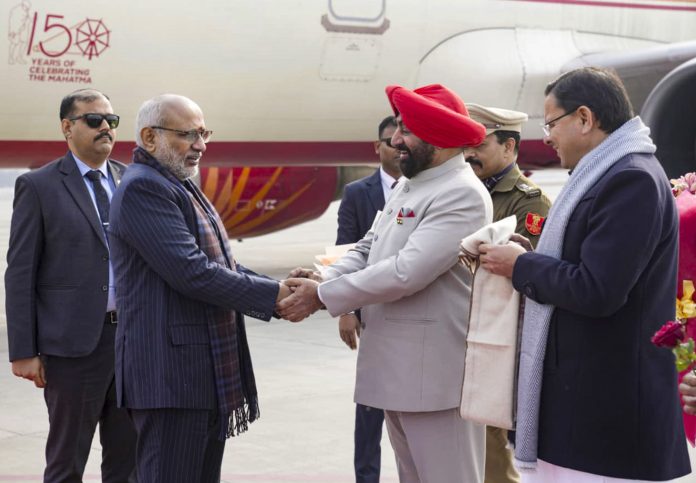 **EDS: THIRD PARTY IMAGE** In this image posted on Jan. 17, 2026, Vice President C. P. Radhakrishnan being welcomed by Uttarakhand Governor Lt Gen Gurmit Singh (Retd.) and Chief Minister Pushkar Singh Dhami upon his arrival in Dehradun. (@VPIndia/X via PTI Photo)(PTI01_17_2026_000106B)
