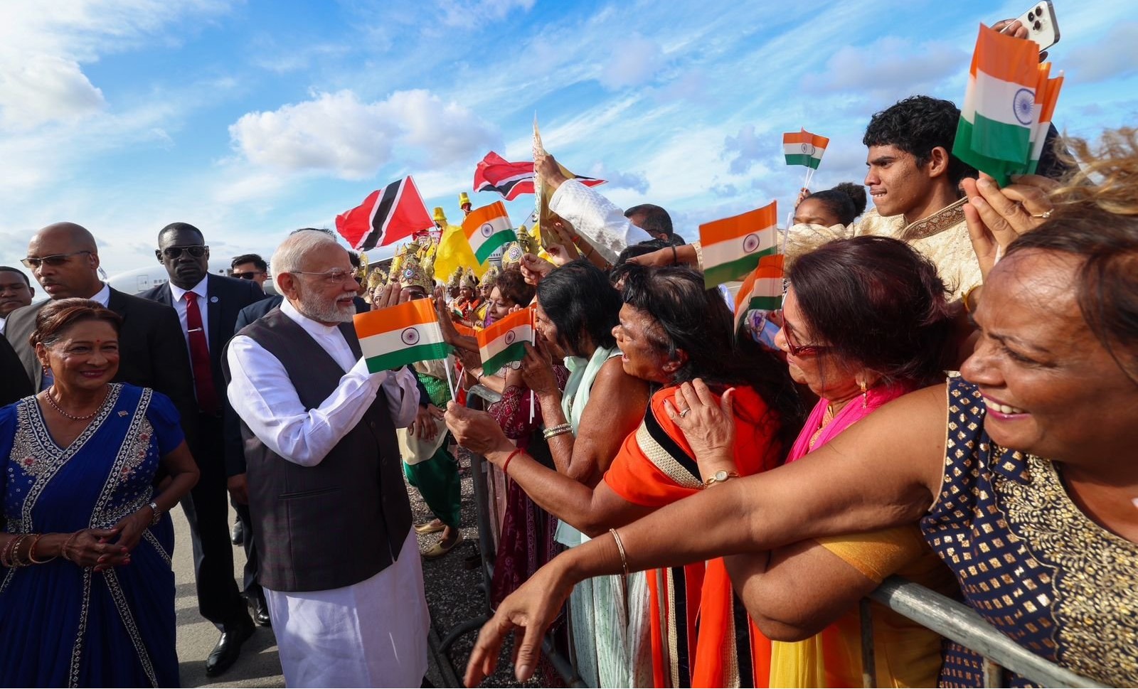 • சிறப்பு வரவேற்பு: பிரதமர் மோடி, திரினிடாட் மற்றும் டொபாகோவின் பிரதமர் பெர்சாட்-பிஸ்ஸெசாரால் விமான நிலையத்தில் வரவேற்கப்பட்டார்.