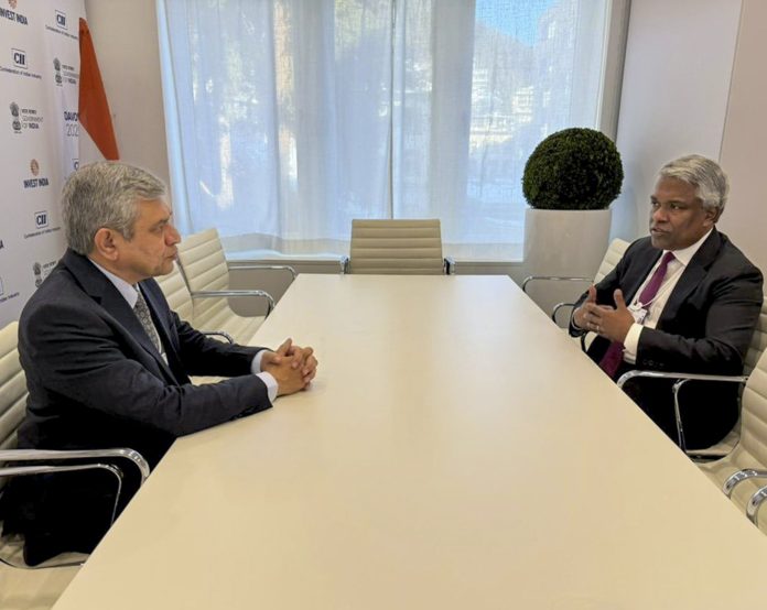**EDS: THIRD PARTY IMAGE** In this image posted on Jan. 20, 2026, Union Minister for Railways Ashwini Vaishnaw during a meeting at the World Economic Forum 2026, in Davos, Switzerland. (@AshwiniVaishnaw/X via PTI Photo) (PTI01_20_2026_000460B)