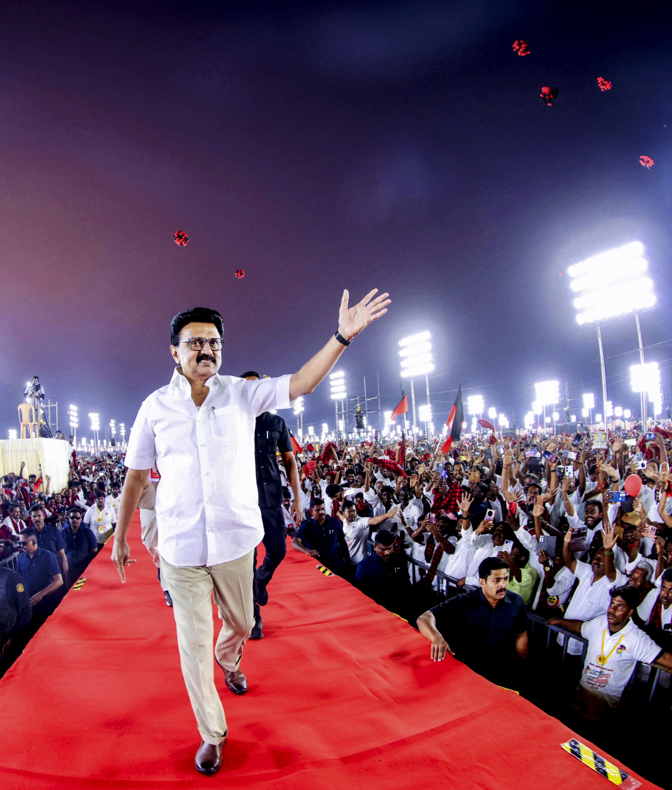 Tiruchirappalli: DMK president and Tamil Nadu Chief Minister MK Stalin greets supporters during the party's 12th State Conference, in Tiruchirappalli district, Monday, March 9, 2026. (PTI Photo)(PTI03_09_2026_000510B)