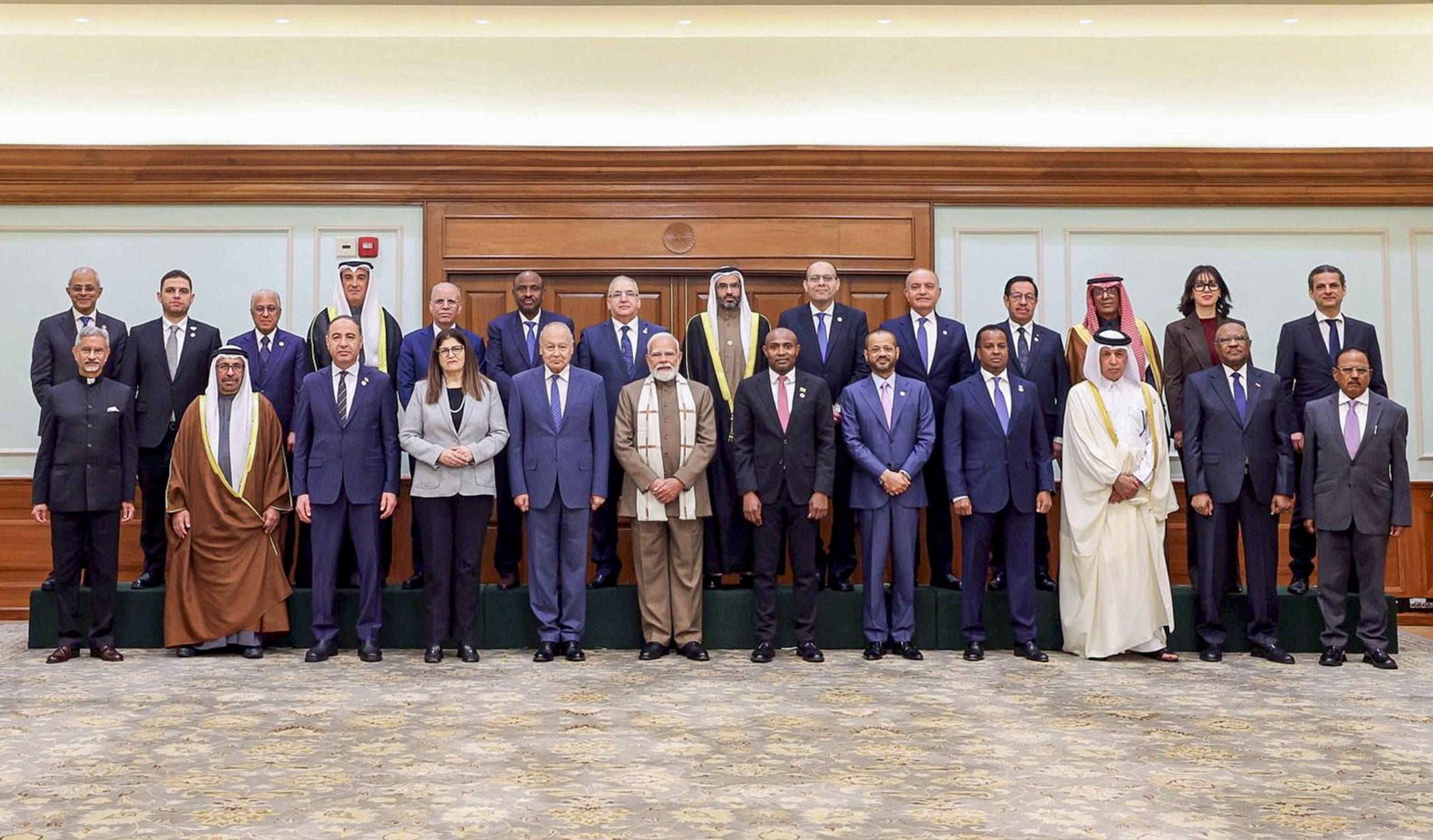 **EDS: THIRD PARTY IMAGE** In this image posted on Jan. 31, 2026, Prime Minister Narendra Modi, centre, poses for pictures with the Foreign Ministers and delegations of the Arab League, in New Delhi. Union Foreign Affairs Minister S Jaishankar, left, and National Security Advisor Ajit Doval, right, are also seen. (@narendramodi/X via PTI Photo)(PTI01_31_2026_000361B)