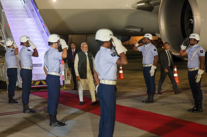 மோடி ரியோ டி ஜெனீரோவின் கிலியோ சர்வதேச விமான நிலையத்தில் சனிக்கிழமை மாலை (உள்ளூர் நேரம்) வரவேற்பு விழாவுடன் வரவேற்கப்பட்டார். இது, அவரது ஐந்து நாடுகள் சுற்றுப்பயணத்தின் நான்காவது கட்டமாகும்.