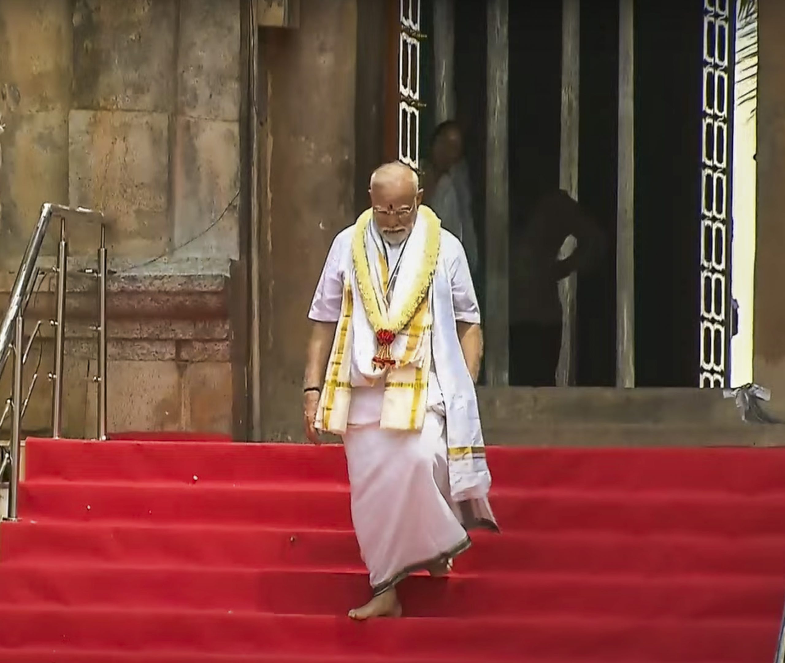 **EDS: THIRD PARTY IMAGE** In this screenshot from a video via @pmoindia on July 27, 2025, Prime Minister Narendra Modi during a visit at Brihadisvara Temple at Gangaikonda Cholapuram, in Ariyalur district of Tamil Nadu. (@pmoindia via PTI Photo)(PTI07_27_2025_000086B)