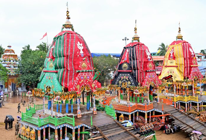 Puri: The chariots of Lord Jagannath, Lord Balabhadra and Goddess Subhadra before the ‘Bahuda Yatra’, the return journey of the trinity, in Puri, Odisha, Saturday, July 5, 2025. (PTI Photo) (PTI07_05_2025_000015B)