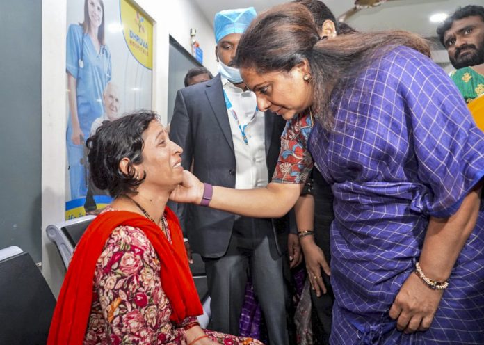 **EDS: THIRD PARTY IMAGE** In this image released by @RaoKavitha via X on July 1, 2025, Telangana Jagruthi President and BRS MLC K Kavitha meets family member of an injured at a hospital, after an explosion at a pharma plant on Monday, in Sangareddy district, Telangana. At least 36 people were killed and several others suffered injuries in the incident, according to officials. (@RaoKavitha via PTI Photo) (PTI07_01_2025_000315B)