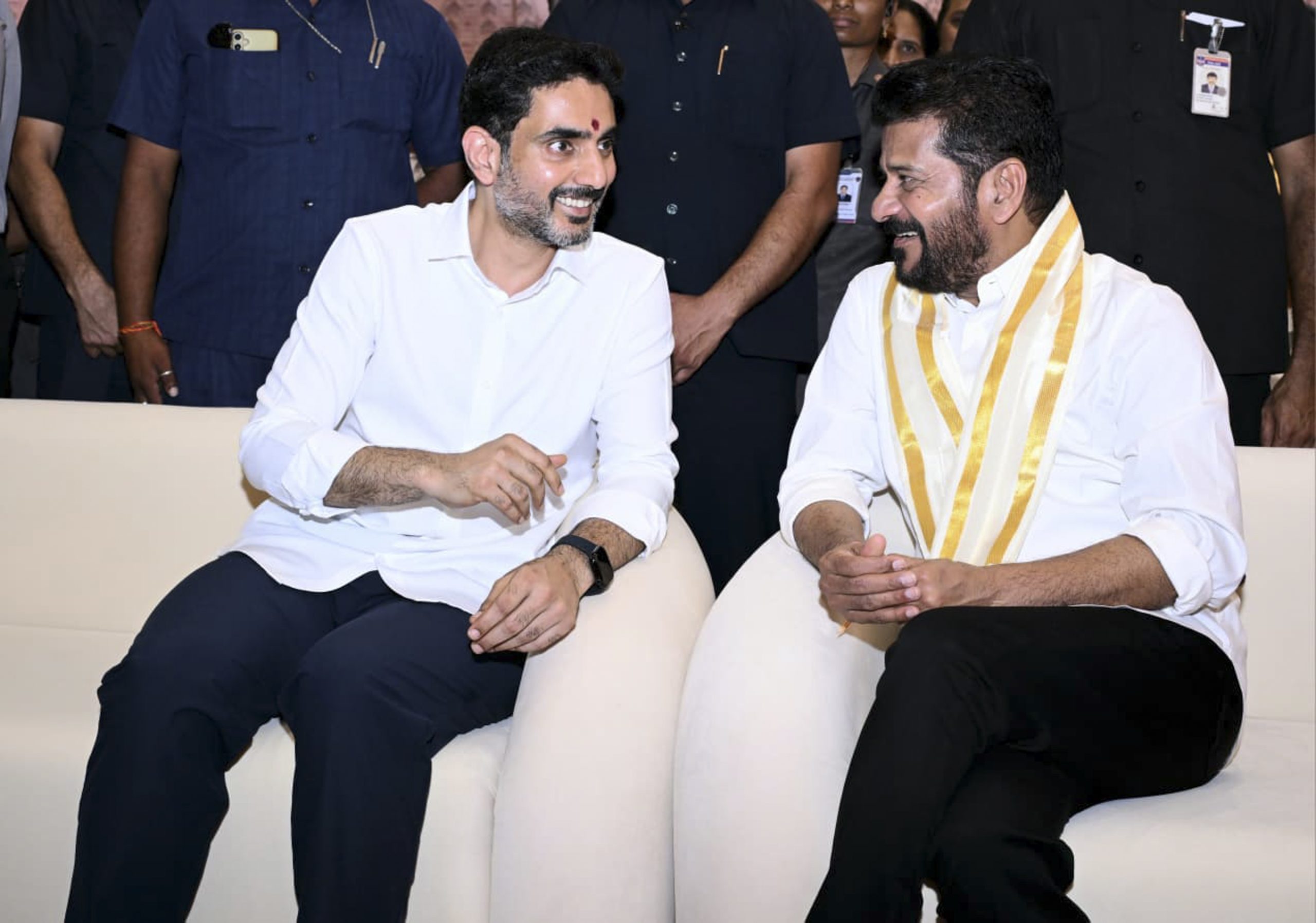 **EDS: THIRD PARTY IMAGE; SPECIAL PACKAGE** In this image received on March 25, 2026, Telangana Chief Minister Revanth Reddy and Andhra Pradesh Minister Nara Lokesh attend the wedding ceremony of Telugu Desam Party (TDP) MLA Dhulipalla Narendra Kumar's daughter Naga Sai Vydeepthi with Kevin Ram, in Guntur. (Handout via PTI Photo) (PTI03_25_2026_000426B) *** Local Caption ***