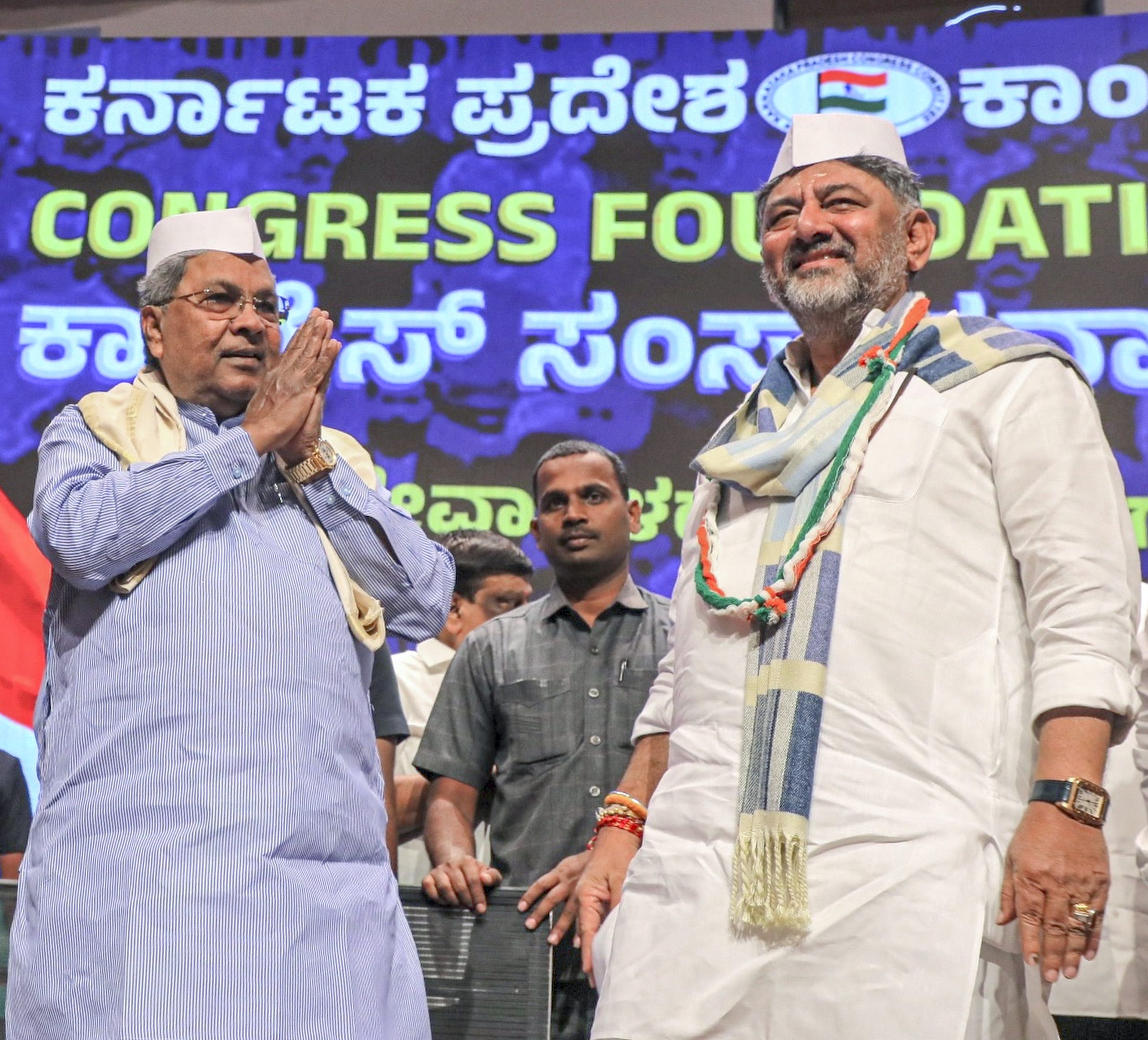 **EDS: THIRD PARTY IMAGE** In this image received on Dec. 28, 2025, Karnataka Chief Minister Siddaramaiah and state Deputy Chief Minister DK Shivakumar during an event marking the 140th Foundation Day of Congress, in Bengaluru. (CMO via PTI Photo) (PTI12_28_2025_000150B)