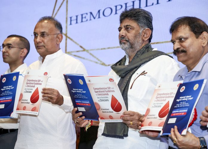 Bengaluru: Karnataka Deputy Chief Minister DK Shivakumar with state Health Minister Dinesh Gundu Rao during the launch of the Hemophilia Prophylaxis program, at Jawaharlal Nehru Planetarium in Bengaluru, Wednesday, Feb. 25, 2026. (PTI Photo) (PTI02_25_2026_000227B)