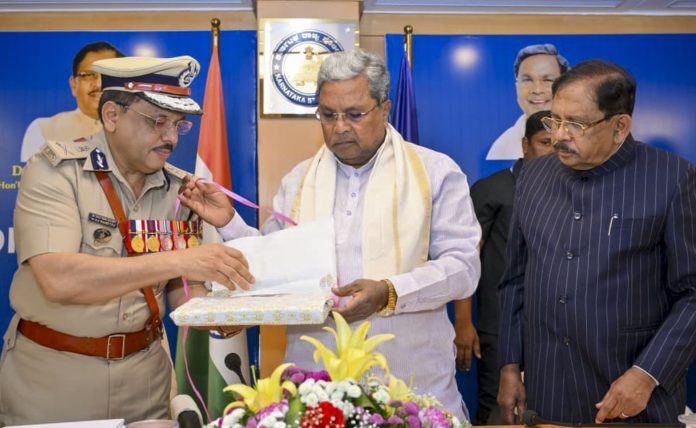 **EDS: THIRD PARTY IMAGE** In this image posted on Jan. 17, 2026, Karnataka Chief Minister Siddaramaiah, centre, with Home Minister G Parameshwara,right, and Director General of Police MA Saleem during the inauguration of the annual conference of senior police officers, in Bengaluru. (@siddaramaiah/X via PTI Photo)(PTI01_17_2026_000223B)