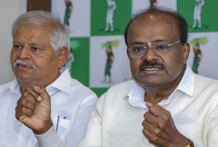 Bengaluru: Union Minister and Janata Dal (Secular) leader H D Kumaraswamy, right, addresses a press conference, in Bengaluru, Monday, Jan. 5, 2026. (PTI Photo)(PTI01_05_2026_000257B)