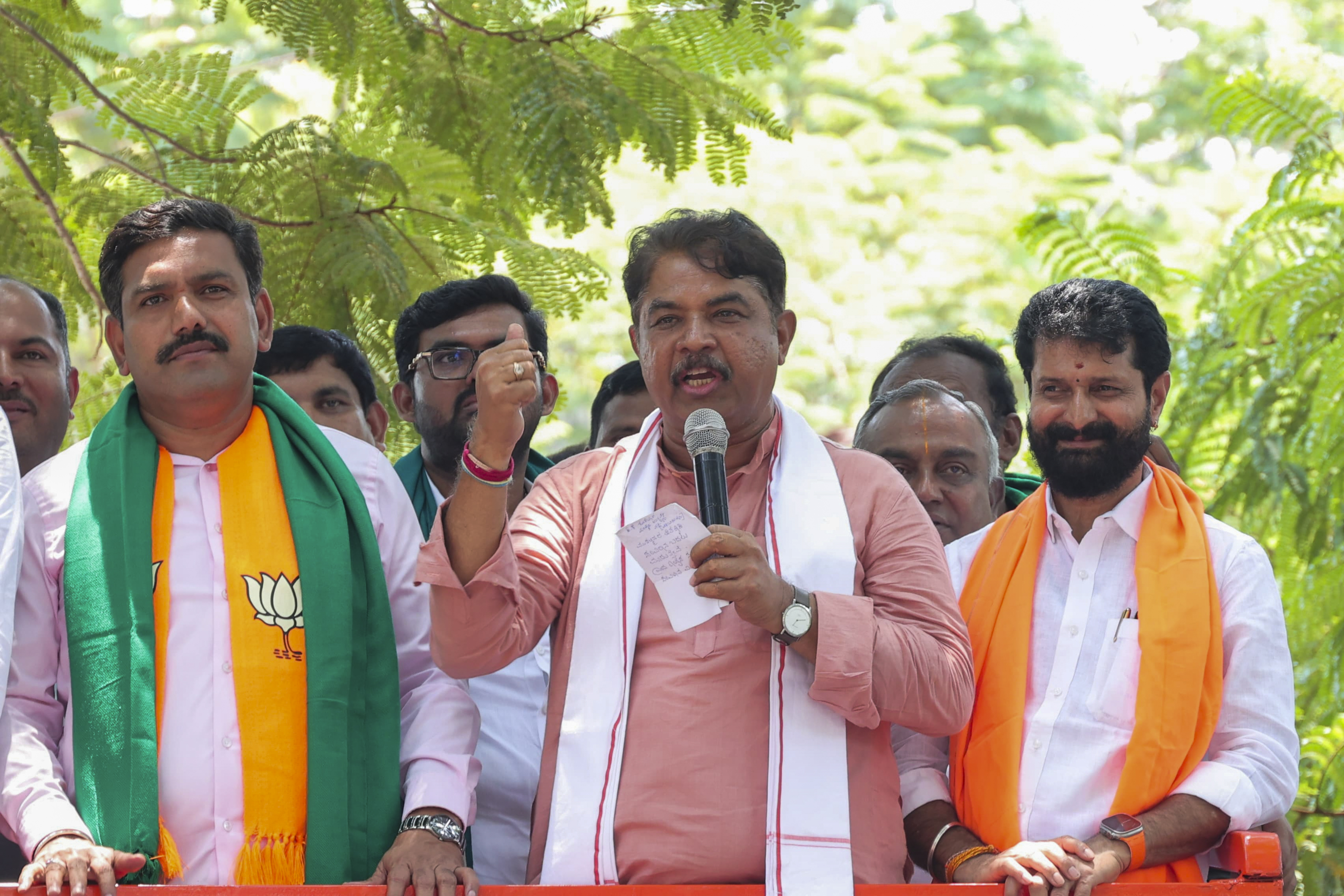 **EDS: THIRD PARTY IMAGE** In this image by BJP Media Cell, LoP in the Karnataka Assembly R. Ashoka speaks as BJP state President and MLA B.Y. Vijayendra and leader C T Ravi look on during a protest rally 'Janakrosha Yatra' against the Congress-led state government over the price hike of essential commodities, in Mandya, Karnataka, Tuesday, April 8, 2025. (BJP Media Cell via PTI Photo) (PTI04_08_2025_000303B)
