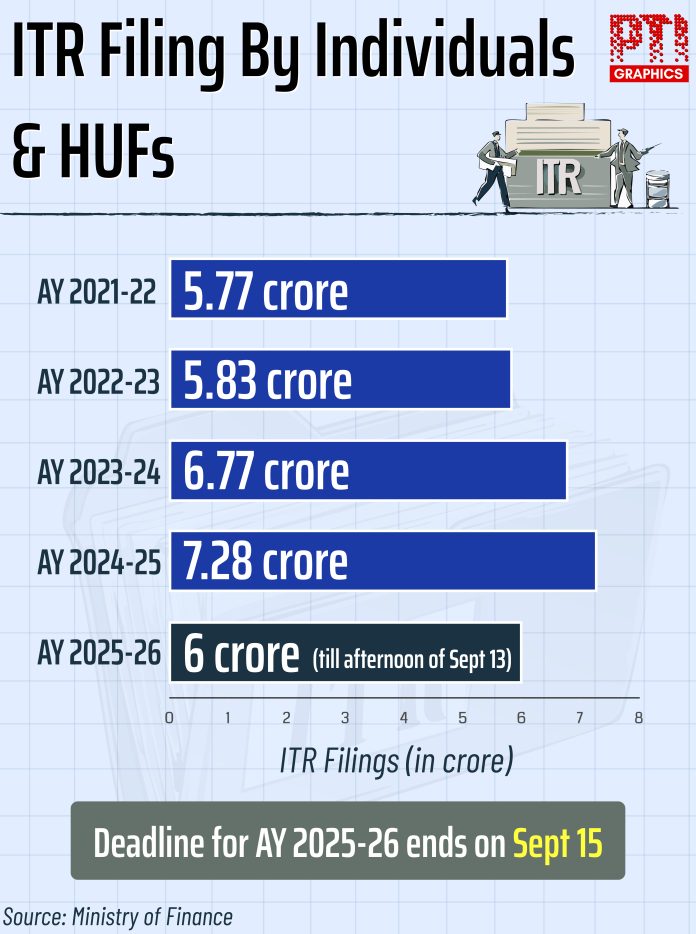 സെപ്തംബർ 15 വരെ റെക്കോർഡ് 7.3 കോടിയിലധികം ഐടിആർ ഫയൽ ചെയ്തു, കഴിഞ്ഞ വർഷത്തെ 7.28 കോടിയെ മറികടന്നതായി സെൻട്രൽ ബോർഡ് ഓഫ് ഡയറക്ട് ടാക്സ് (സിബിഡിടി) അറിയിച്ചു.