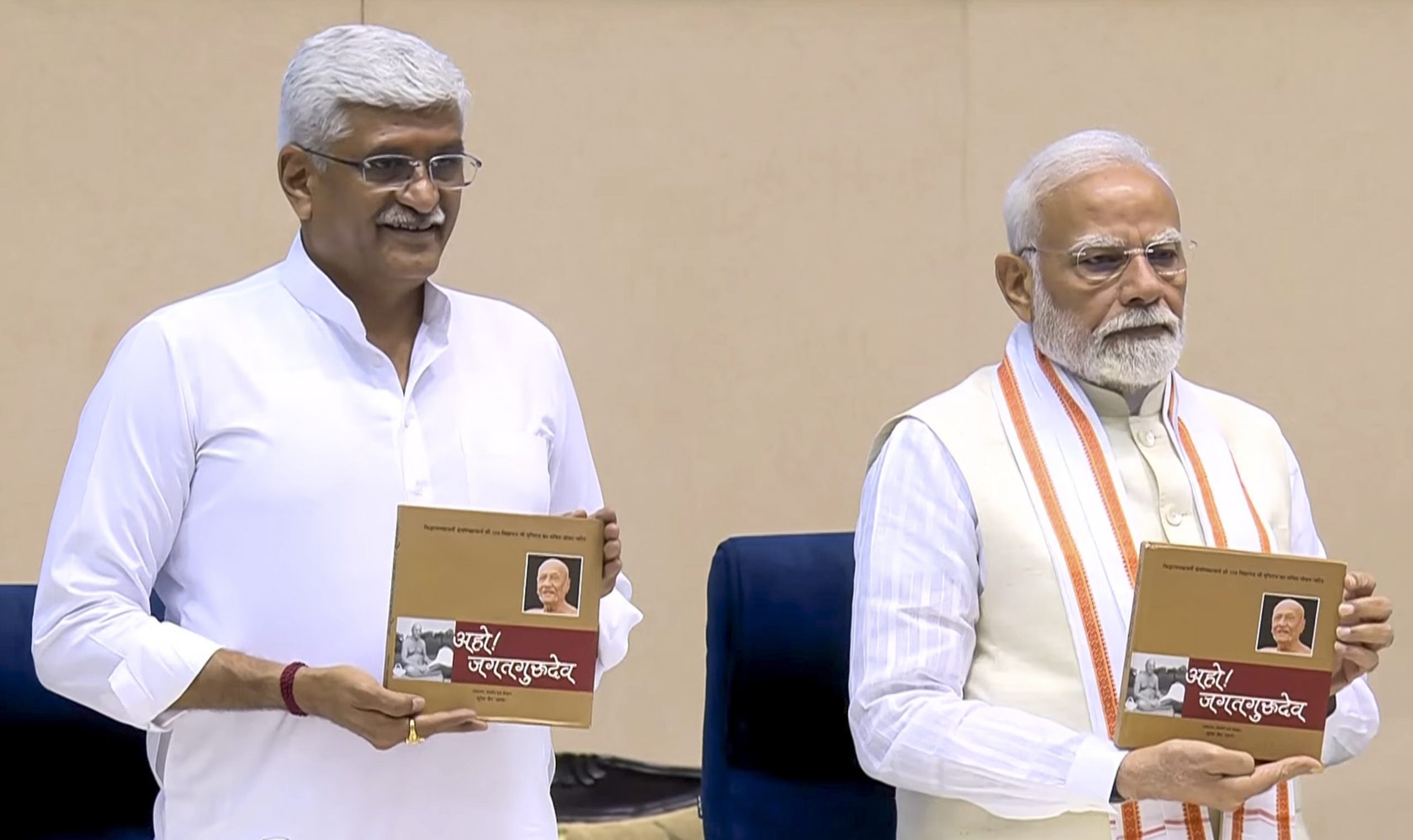 **EDS: THIRD PARTY IMAGE** New Delhi: In this screenshot via PMO website, Prime Minister Narendra Modi with Union Minister of Culture Gajendra Singh Shekhawat during the centenary celebrations of Acharya Vidyanand Ji Maharaj, in New Delhi, Saturday, June 28, 2025. (PMO via PTI Photo)(PTI06_28_2025_000039B)
