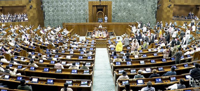 **EDS: THIRD PARTY IMAGE; SCREENGRAB VIA SANSAD TV** New Delhi: Lok Sabha Speaker Om Birla conducts proceedings in the House amid protest by opposition members in the well on the first day of the Winter Session of Parliament, in New Delhi, Monday, Dec. 1, 2025. (Sansad TV via PTI Photo)(PTI12_01_2025_000073B)