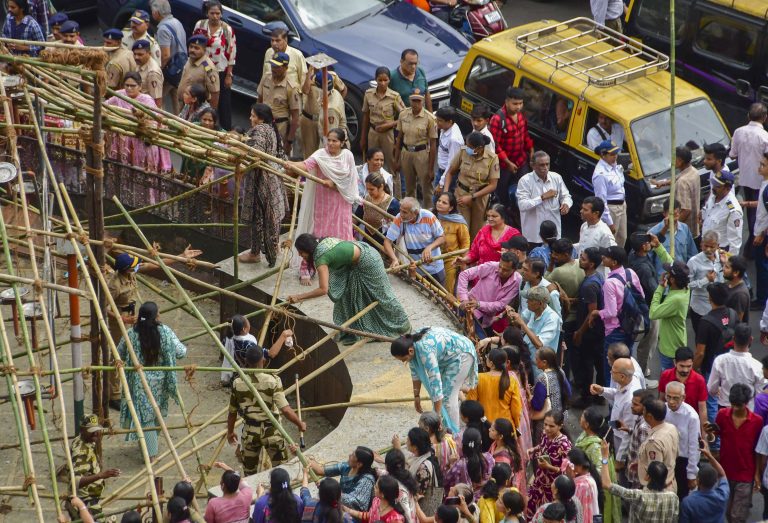 പ്രതിഷേധക്കാർ, കൂടുതലും ജൈന സമുദായത്തിലെ അംഗങ്ങൾ, പോലീസുമായി ഏറ്റുമുട്ടി, അവർ സൈറ്റിലെ മുള സ്കാർഫോൾഡിംഗിൽ സ്ഥാപിച്ച വലിയ പ്ലാസ്റ്റിക് കവർ നീക്കം ചെയ്യുന്നതിൽ നിന്ന് അവരെ തടയാൻ ശ്രമിച്ചു.