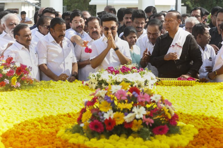 ചെന്നൈഃ ഡിഎംകെ നേതാവ് എം കരുണാനിധിയുടെ ഏഴാം ചരമവാർഷികത്തിൽ വ്യാഴാഴ്ച തമിഴ്നാട് മുഖ്യമന്ത്രി എം കെ സ്റ്റാലിൻ നയിക്കുന്ന നിശബ്ദ മാർച്ച് അദ്ദേഹത്തിന്റെ മറീന ബീച്ച് ഫ്രണ്ട് സ്മാരകത്തിൽ പുഷ്പചക്രം അർപ്പിച്ചു.