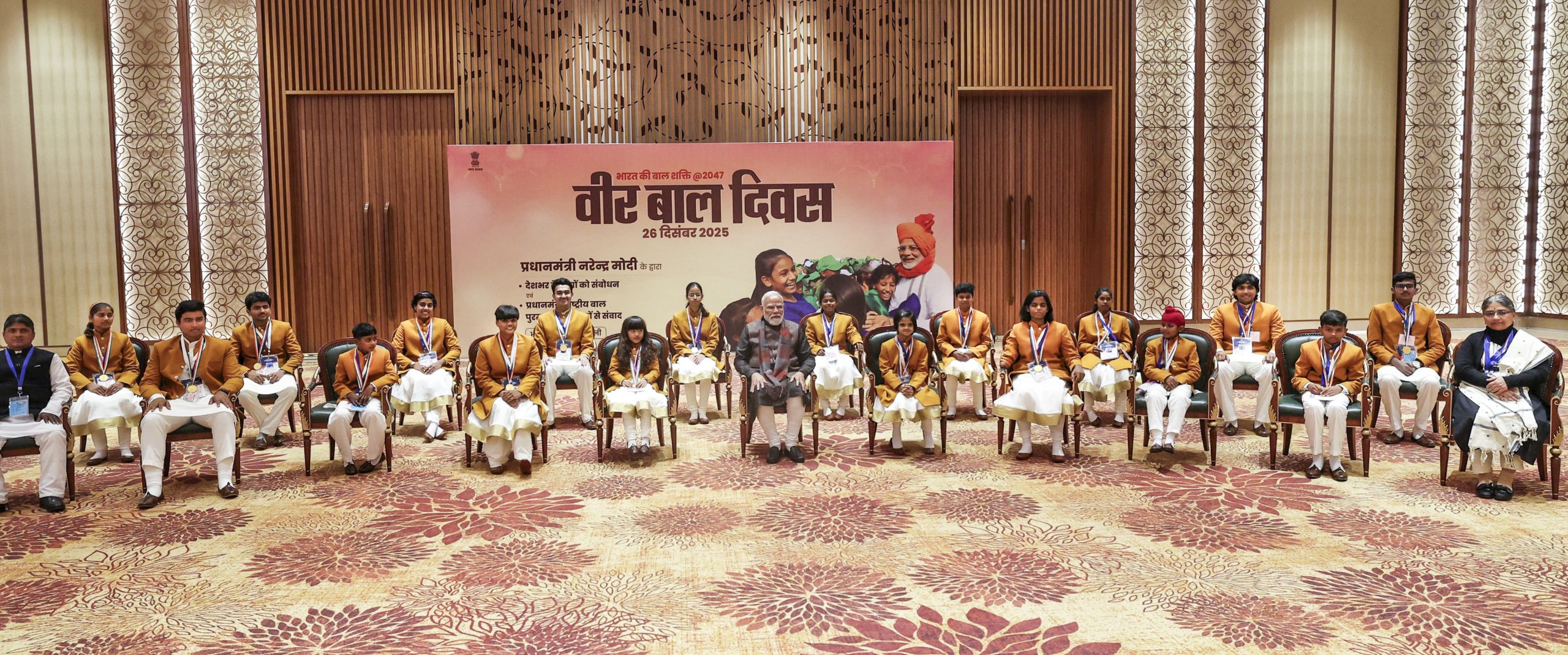 **EDS: THIRD PARTY IMAGE** In this image received on Dec. 26, 2025, Prime Minister Narendra Modi interacts with the recipients of 'Pradhan Mantri Rashtriya Bal Puraskar', during an event on 'Veer Baal Diwas', in New Delhi. (PMO via PTI Photo)(PTI12_26_2025_000265B)