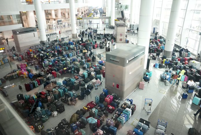 New Delhi: Luggage of passengers piled up at the Indira Gandhi International Airport amid IndiGo flight disruptions, in New Delhi, Monday, Dec. 8, 2025. (PTI Photo/Arun Sharma) (PTI12_08_2025_000219B)