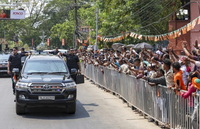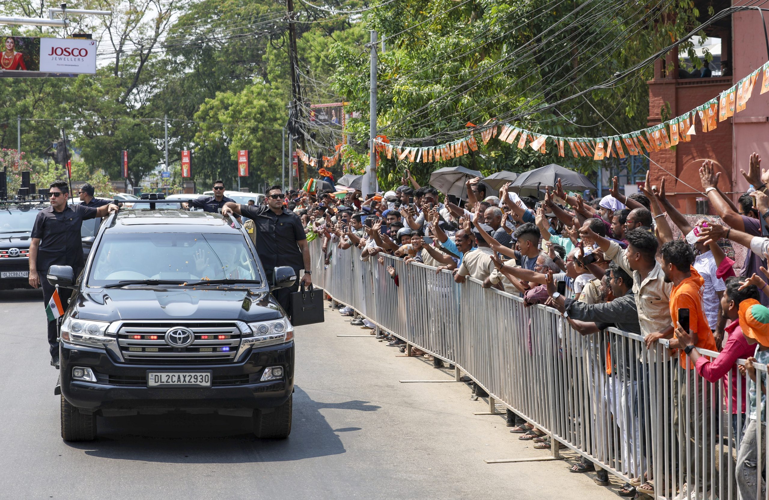 തൃശൂർ (കേരളം), മാർച്ച് 29 (പി.ടി.ഐ) എൻഡിഎയുടെ നിയമസഭ തിരഞ്ഞെടുപ്പ് പ്രചാരണത്തിന്റെ ഭാഗമായി പ്രധാനമന്ത്രി നരേന്ദ്ര മോദി ഞായറാഴ്ച തൃശൂരിൽ ഉത്സാഹഭരിതമായ വൻ റോഡ്ഷോ നടത്തി. ആയിരക്കണക്കിന് ആളുകൾ അദ്ദേഹത്തെ ഒരു കാഴ്ച കാണാനായി റോഡുകളുടെ ഇരുവശങ്ങളിലും നിരന്നു നിന്നു.