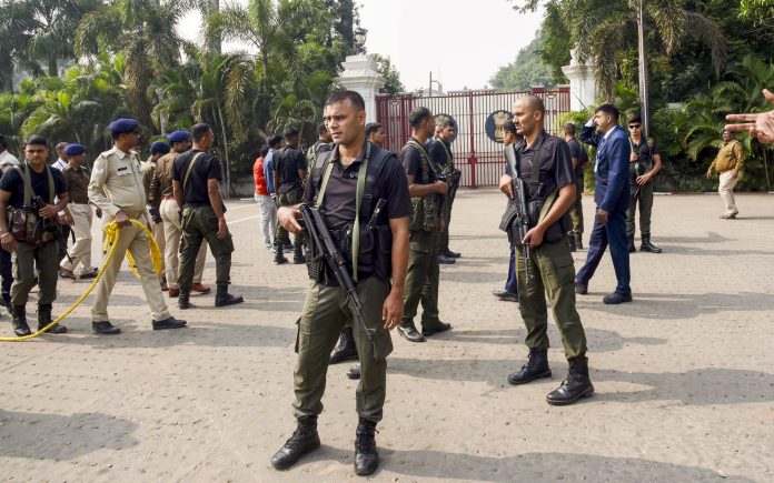 Patna: Security personnel stand guard at Raj Bhavan, in Patna, Monday, Nov. 17, 2025. (PTI Photo)(PTI11_17_2025_000112B)