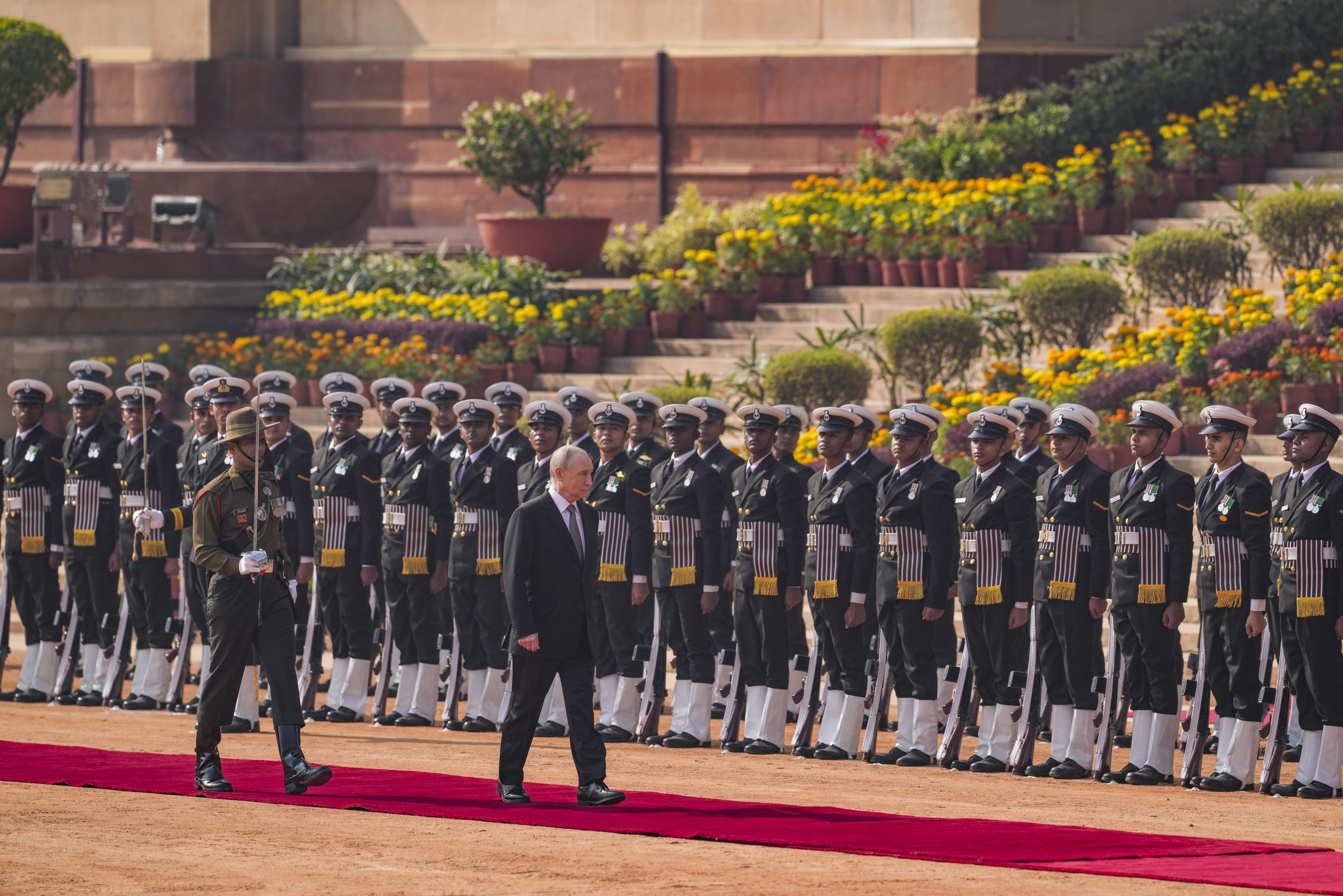 ന്യൂഡൽഹി, ഡിസംബർ 5 (പിടിഐ) പ്രധാനമന്ത്രി നരേന്ദ്ര മോദിയുമായുള്ള ഉച്ചകോടി ചർച്ചകൾക്ക് മുന്നോടിയായി രാഷ്ട്രപതി ഭവന്റെ മുൻവശത്ത് റഷ്യൻ പ്രസിഡന്റ് വ്ളാഡിമിർ പുടിന് വെള്ളിയാഴ്ച ആചാരപരമായ സ്വീകരണം നൽകി.