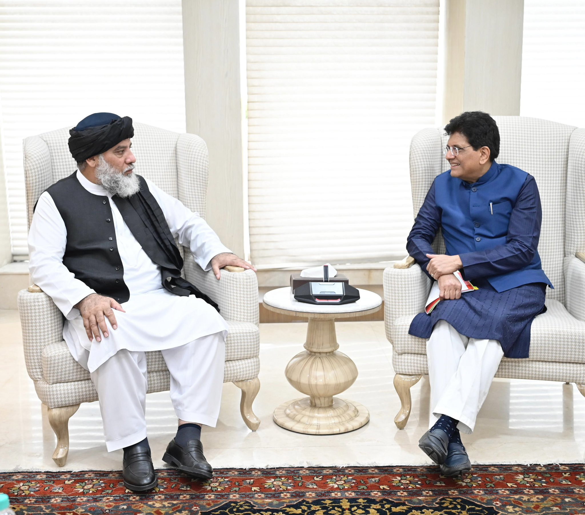 **EDS: THIRD PARTY IMAGE** In this image posted on Nov. 24, 2025, Union Minister of Commerce and Industry Piyush Goyal with Afghanistan's Commerce and Industry Minister Alhaj Nooruddin Azizi during a meeting. (@PiyushGoyal/X via PTI Photo)(PTI11_24_2025_000422B)