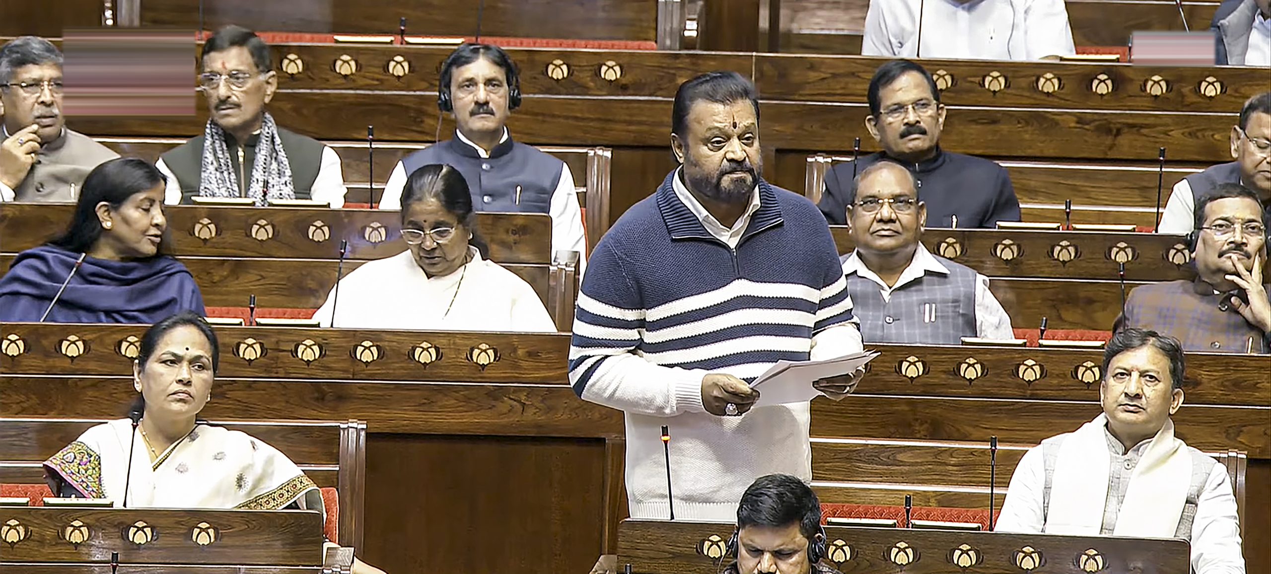 **EDS: THIRD PARTY IMAGE, SCREENGRAB VIA SANSAD TV** New Delhi: BJP MP Suresh Gopi speaks in the Rajya Sabha during the Winter session of Parliament, in New Delhi, Monday, Dec. 15, 2025. (Sansad TV via PTI Photo) (PTI12_15_2025_000102B)