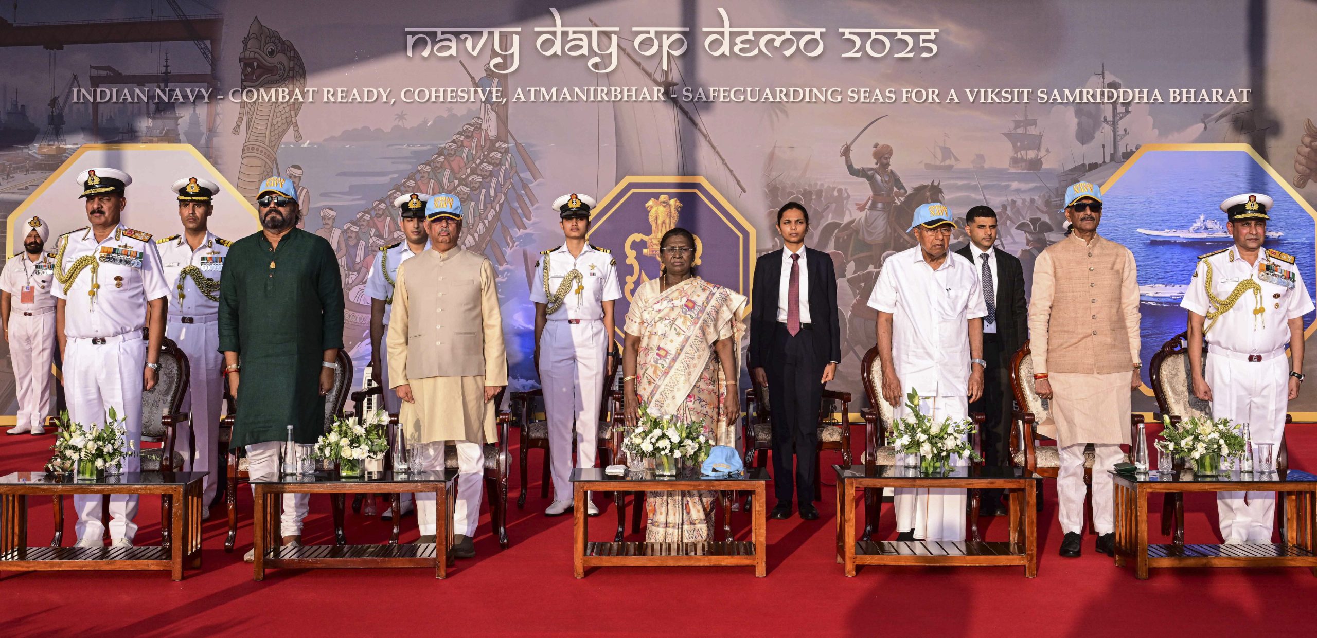 **EDS: THIRD PARTY IMAGE** In this image received on Dec. 3, 2025, President Droupadi Murmu with Kerala Governor Rajendra Vishwanath Arlekar, Chief Minister Pinarayi Vijayan, Navy chief Admiral Dinesh K Tripathi and others during an event organised as part of the Navy Day celebrations, in Thiruvananthapuram, Kerala. (Rashtrapati Bhavan via PTI Photo)(PTI12_03_2025_000688B)